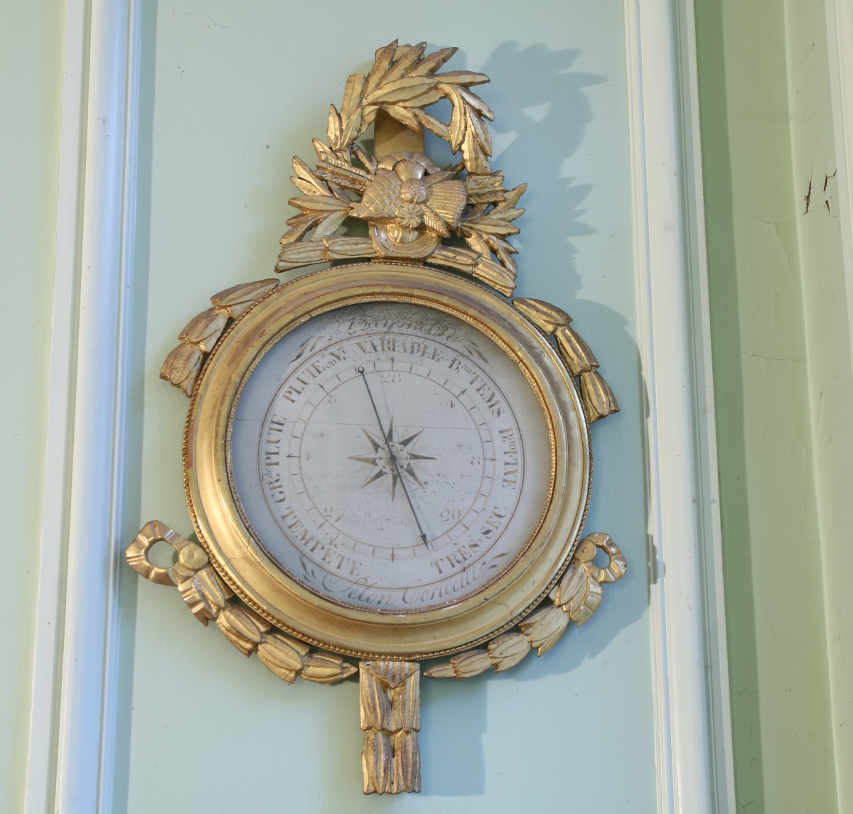 BAROMÈTRE en bois mouluré, sculpté, stuqué et doré. Il reçoit un décor ajouré figurant un panier de fruits percé de flèches et une couronne de lauriers en partie supérieure. Deux guirlandes de lauriers rubanées flanquent le cadran en partie inférieure.