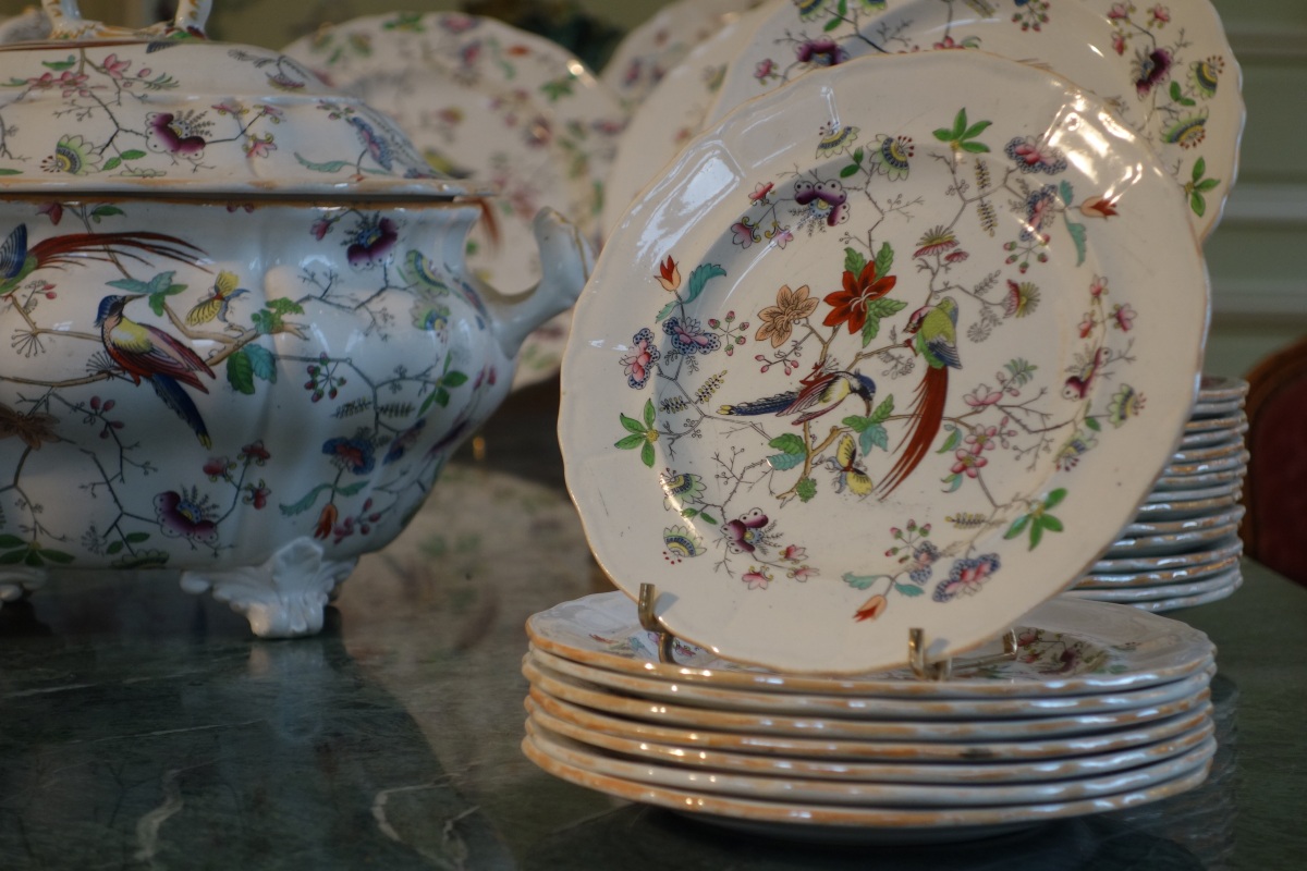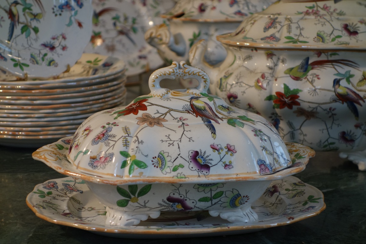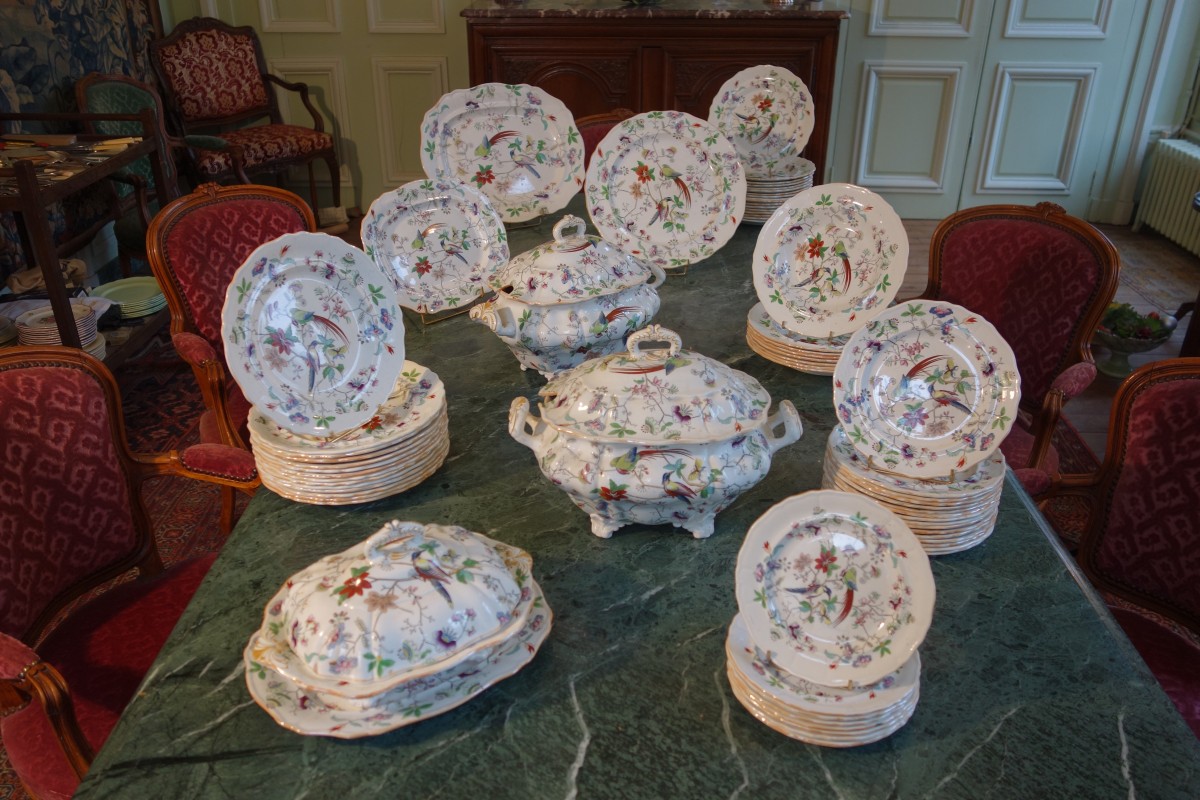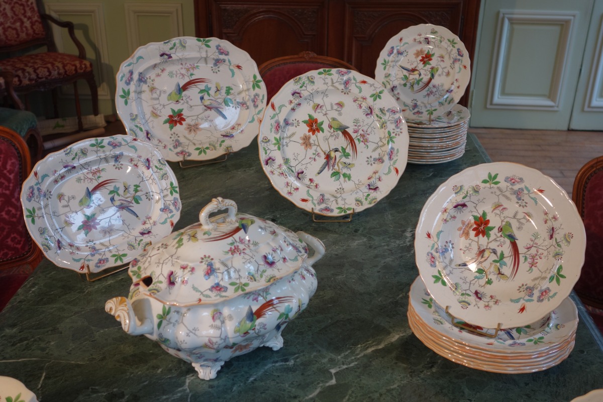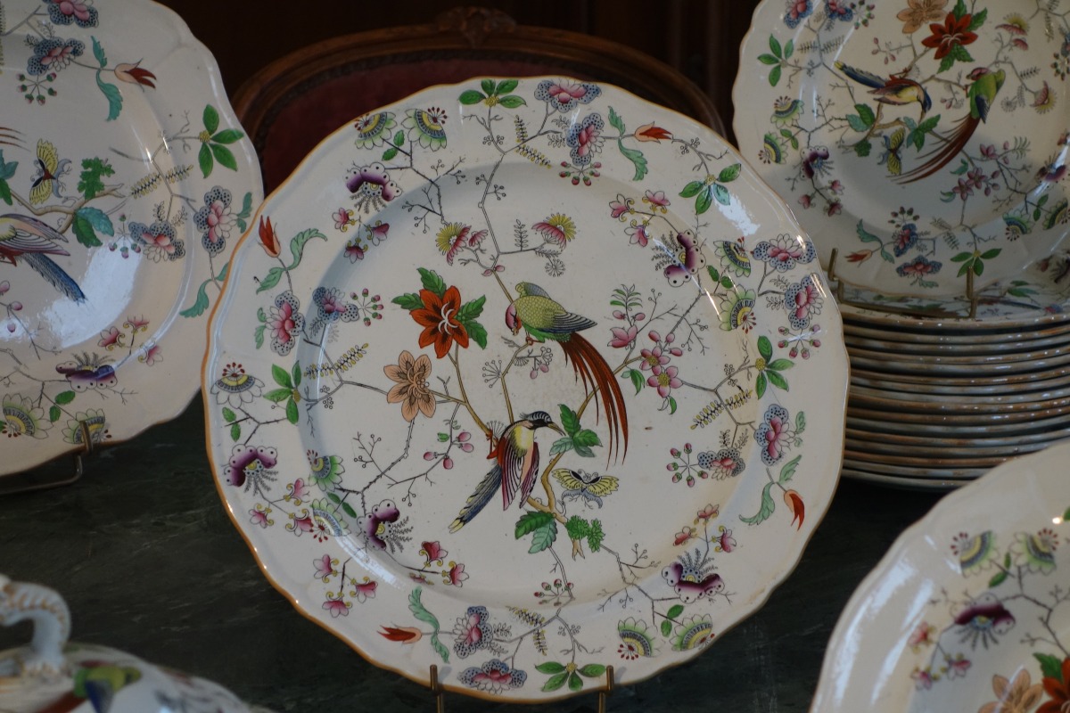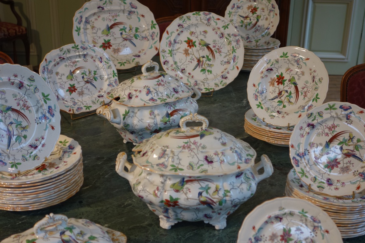 DAVENPORT. Partie de SERVICE en faïence fine, 70 pièces, à décor polychrome d'oiseaux exotiques branchés, fleurs et papillons. Il se compose de deux soupières, d'un légumier couvert, d'un grand plat ovale, d'un grand plat rond, de deux petits plats, de 31 grandes assiettes, de 8 assiettes à soupe, de 16 assiettes à dessert et de 8 assiettes à pain.