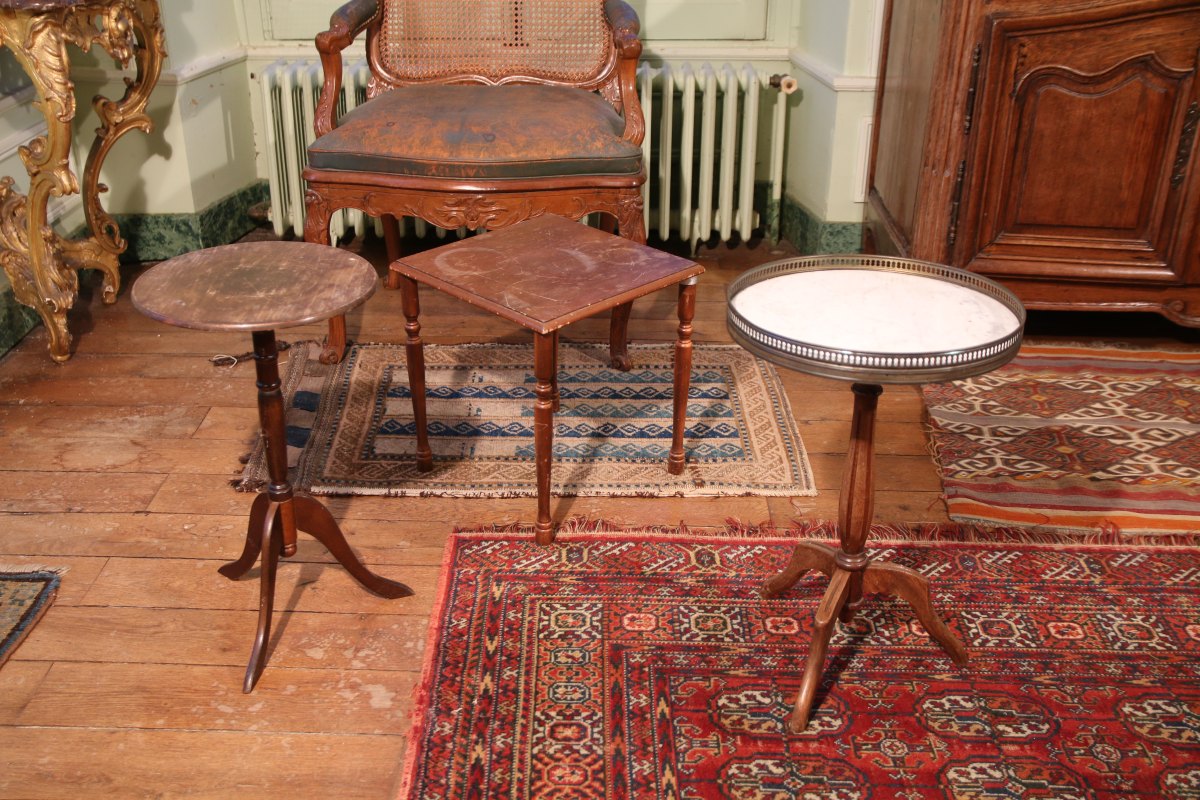 RÉUNION de TROIS petites TABLES VOLANTES à plateau circulaire. L'une coiffée d'un marbre ceint d'une galerie de style Louis XVI. XXe.