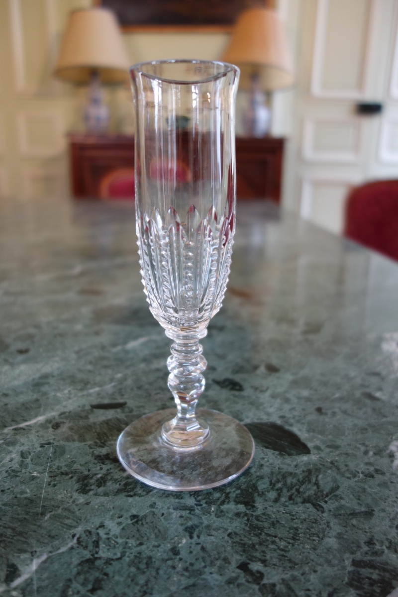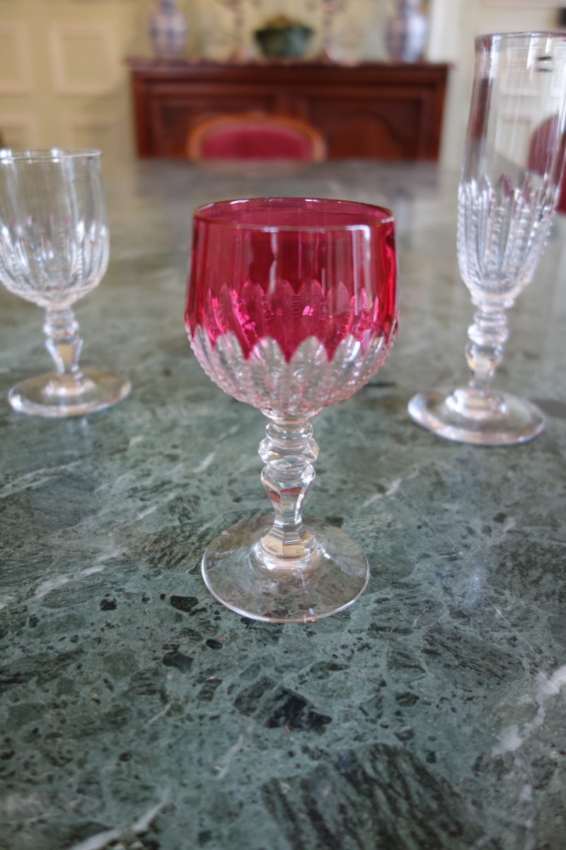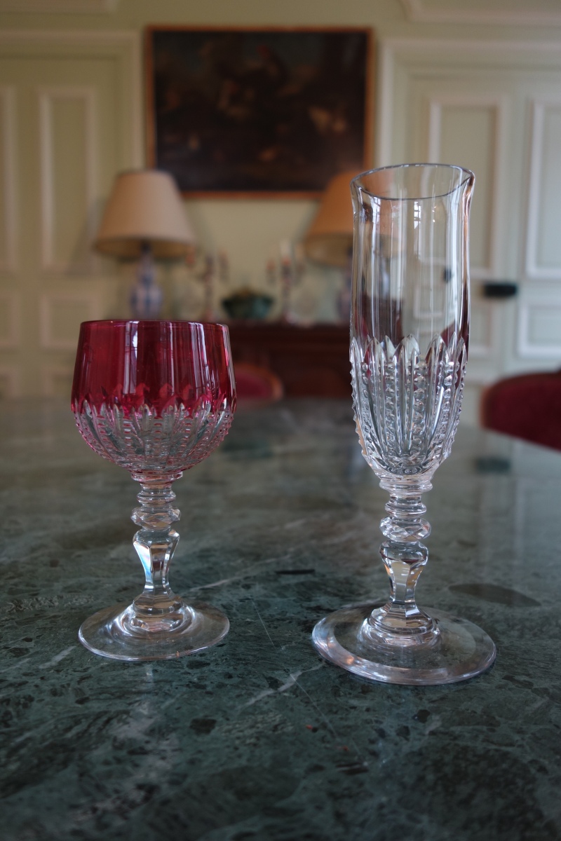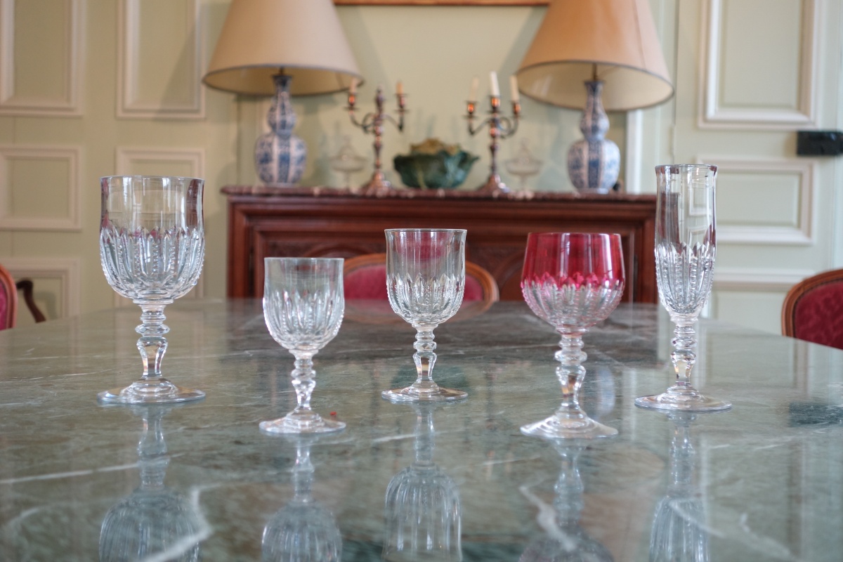 SERVICE en CRISTAL taillé à décor de fleurs de lotus reposant sur un pied ballustre à facette. 68 pièces, dont: 15 verres à eau, 12 verres à vins, 10 flutes à champagne, 14 verres à liqueur, 17 verre à vins d'Alsace de couleur.