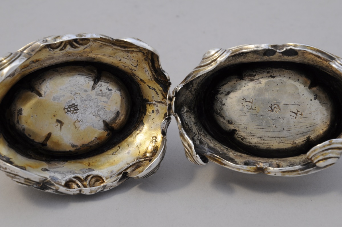 Deux SALERONS en argent formant paire de forme ovale. Bordure chantournée à degrés et piètement plein terminé en enroulements et agrafes affrontées.