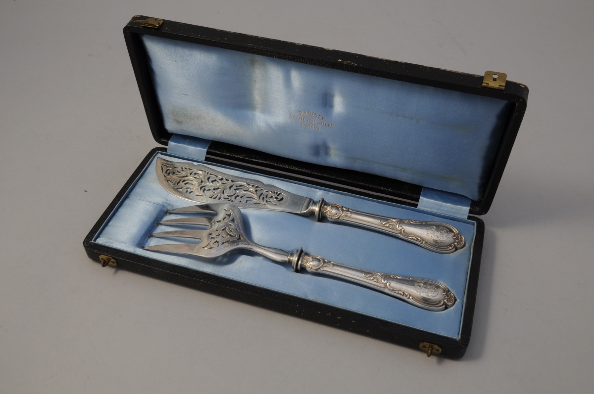 COUVERT DE SERVICE À POISSON en argent. Modèle de style rocaille à décor ajouré et repoussé de feuillages, coquilles et agrafes. Manche en argent fourré. Monogrammé.
