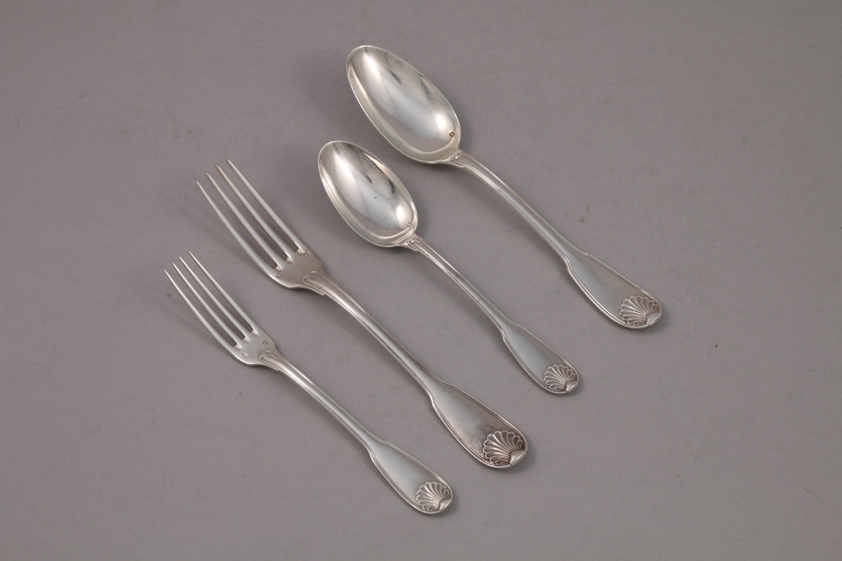 MÉNAGÈRE en argent, 60 pièces, composée de 12 couverts de table, 4 fourchettes de table, 12 couverts à entremets et 6 fourchettes à entremets. Modèle à filet-contour et coquille.