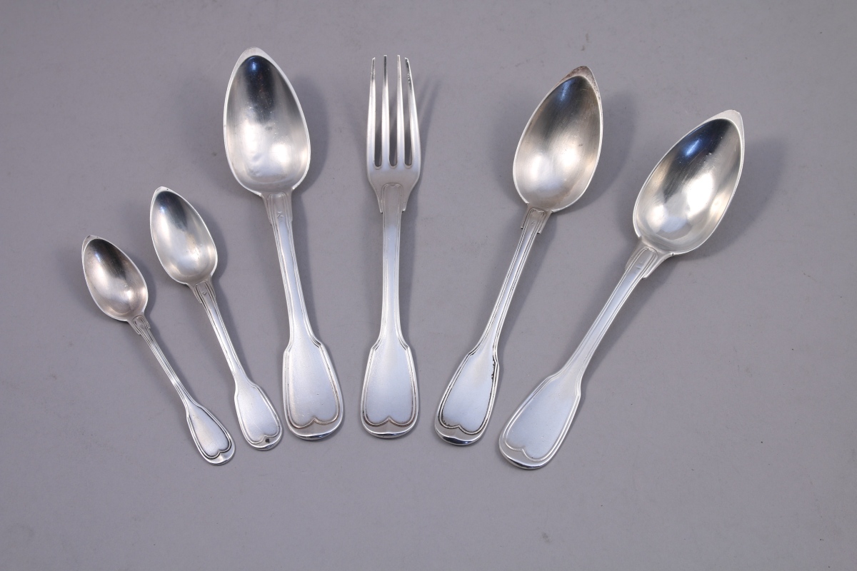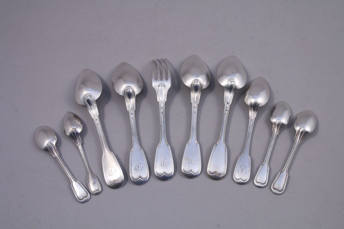 - CHRISTOFLE. Un COUVERT, trois CUILLÈRES et une CUILLÈRE À CAFÉ en métal argenté. Modèle filet-contour monogrammé.