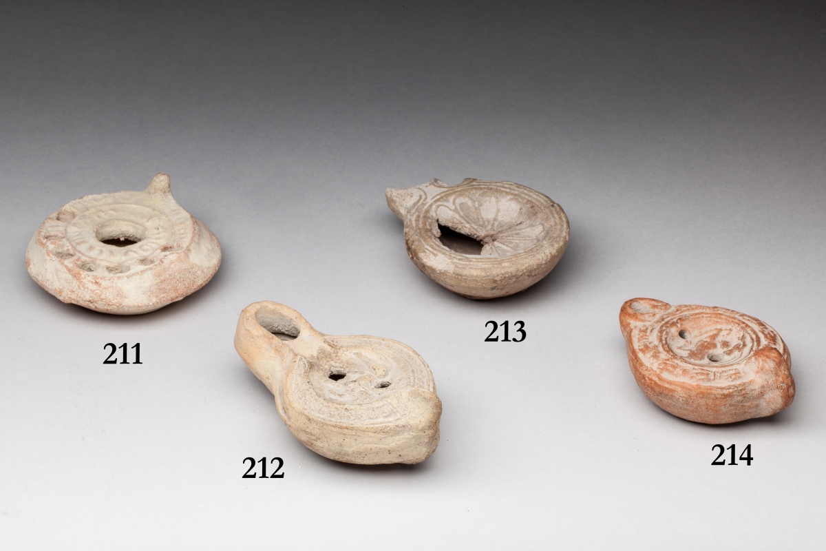 LAMPE À HUILE israélienne discoïde à réservoir rond, elle comporte sept becs. Au revers dans un cercle deux motifs polylobés.