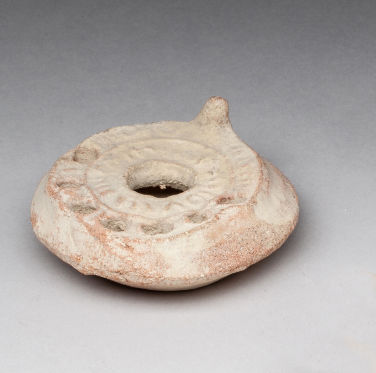LAMPE À HUILE israélienne discoïde à réservoir rond, elle comporte...
