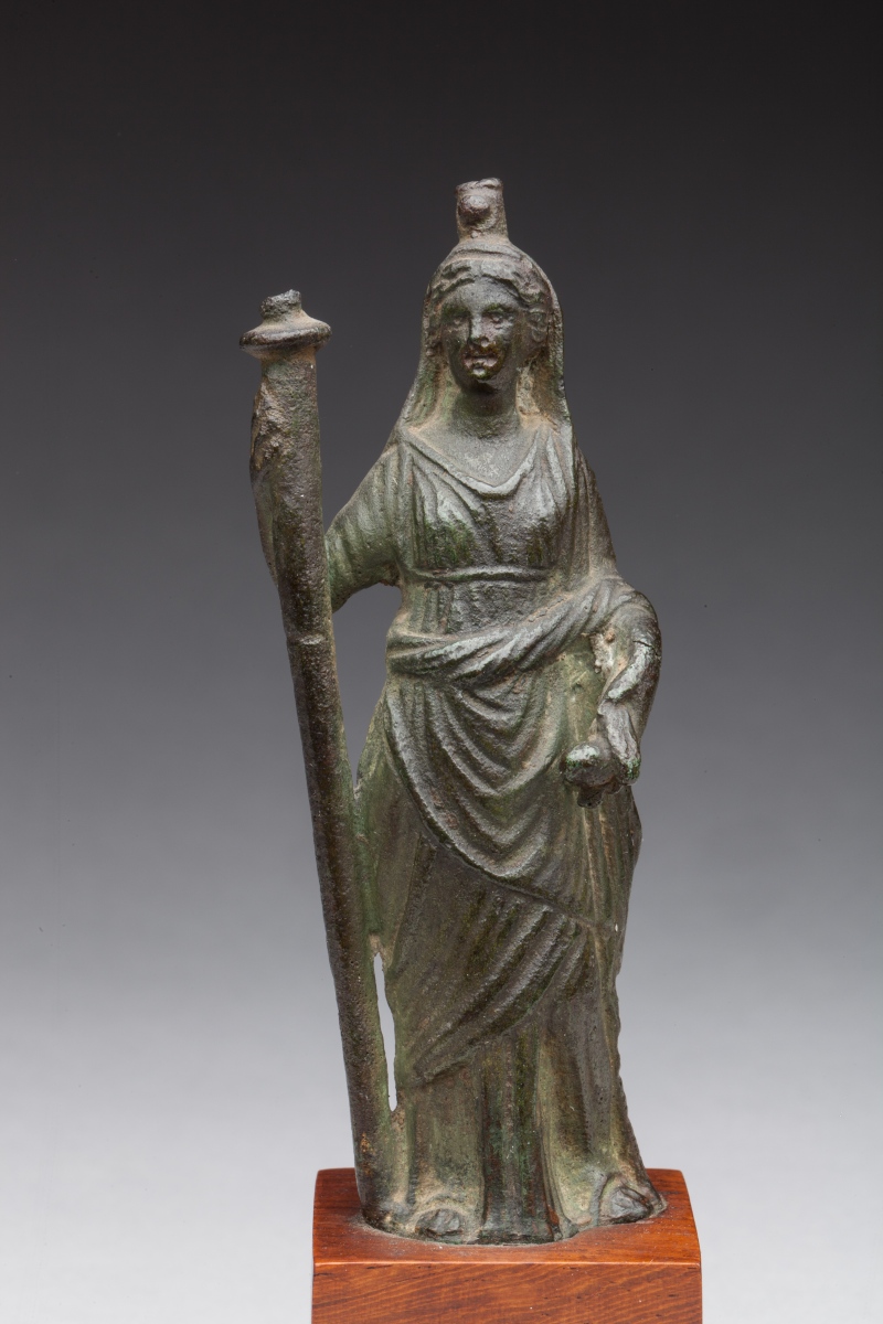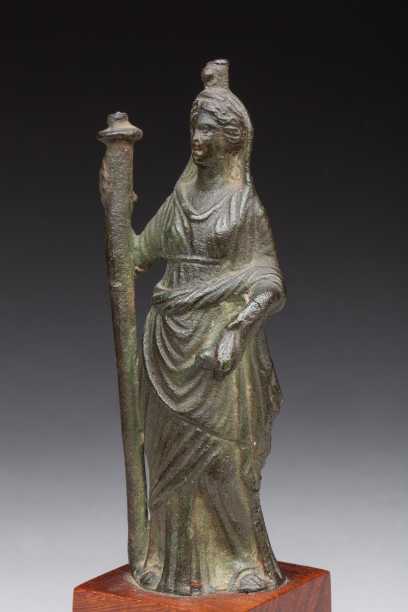 STATUETTE: JUNON. Bronze à belle patine vert sombre. Debout, vêtue d'une robe plissée et d'un voile sur la tête, dans la main droite un flambeau.