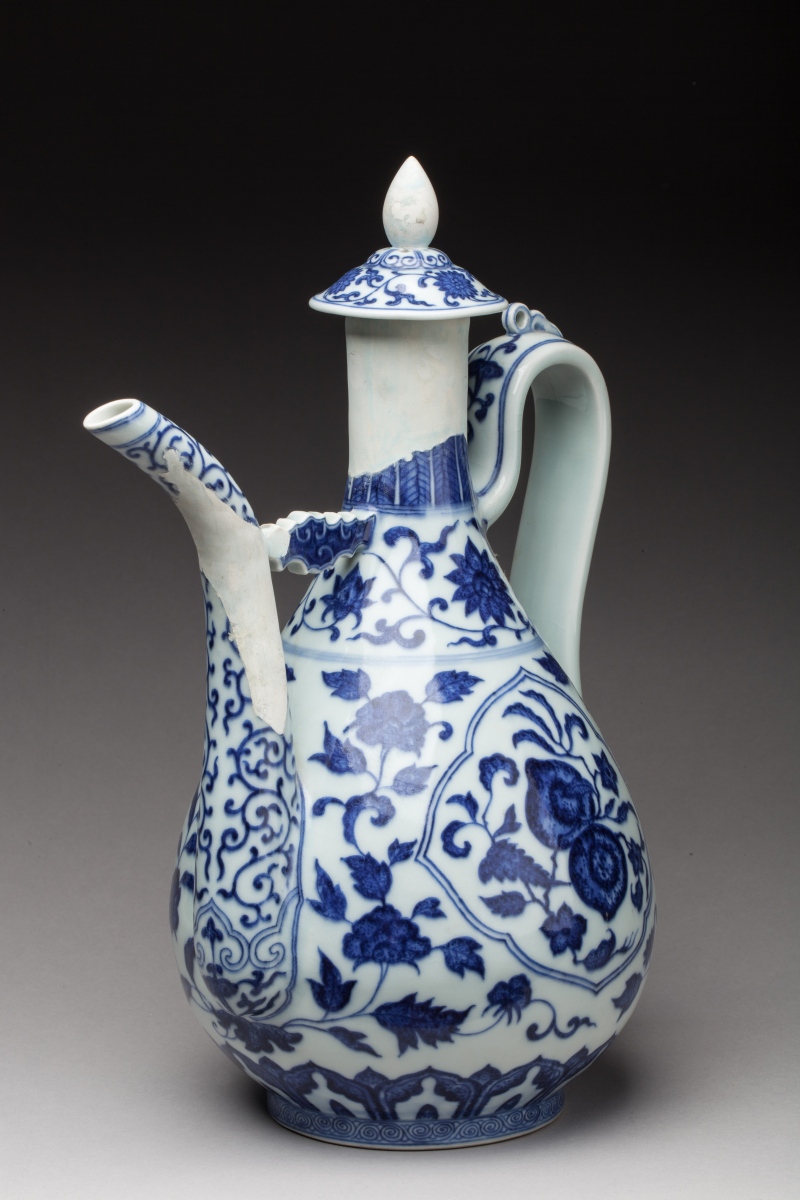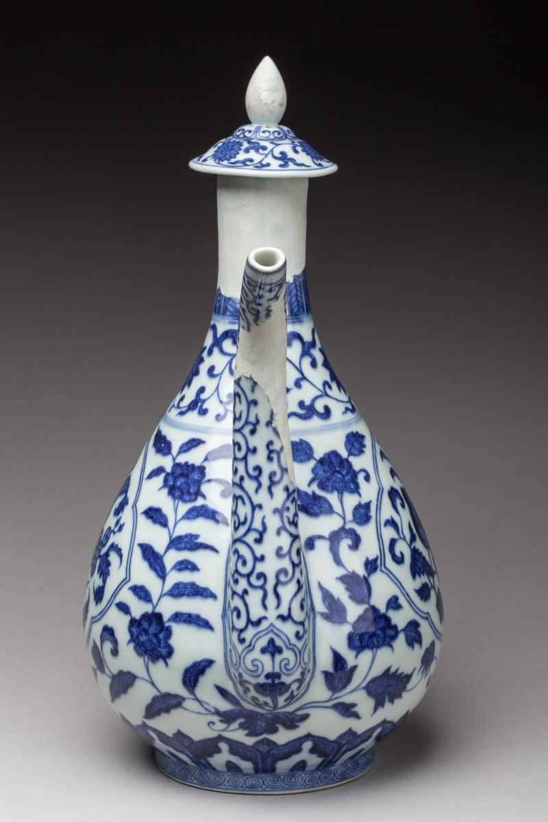 AIGUIÈRE couverte en porcelaine bleu blanc, la panse piriforme ornée de chaque côté de kaki et fleurs dans un cartouche polylobé, de branches fleuries de lotus, le col à décor de feuilles de bananier ; le long bec verseur orné de rinceaux stylisés. Couvercle rapporté.