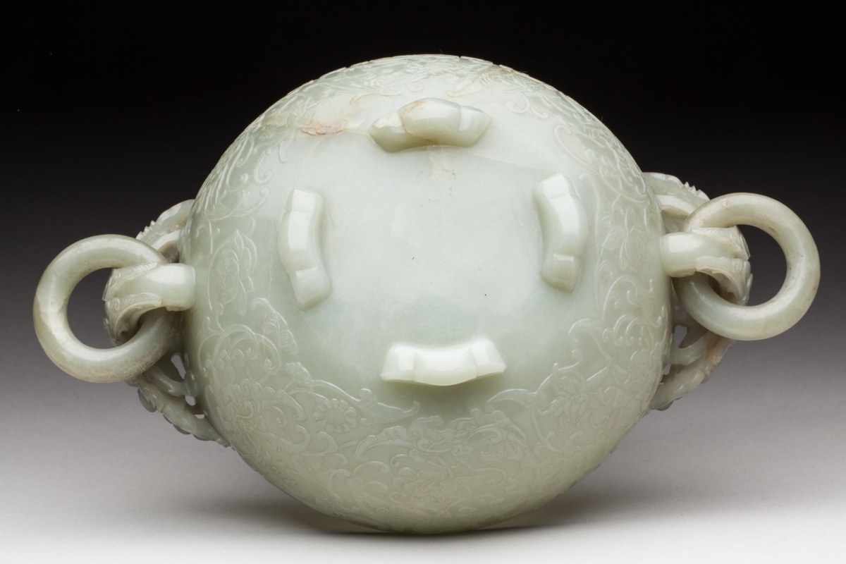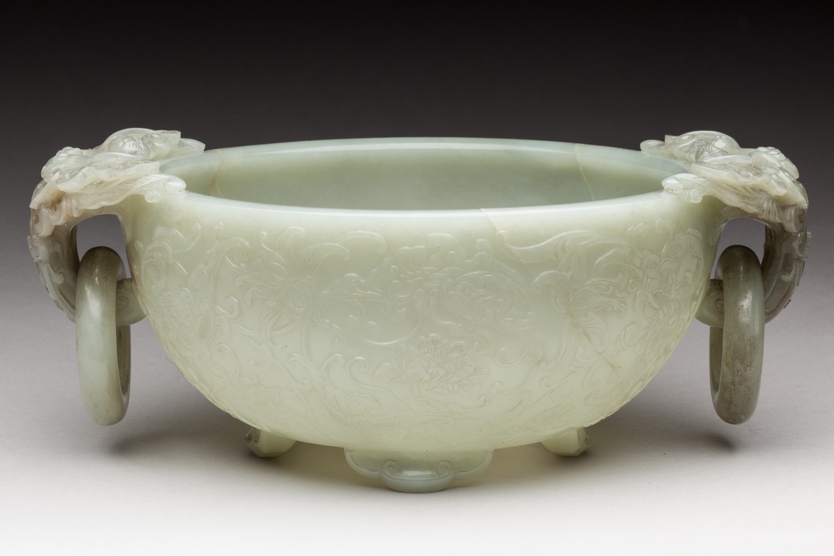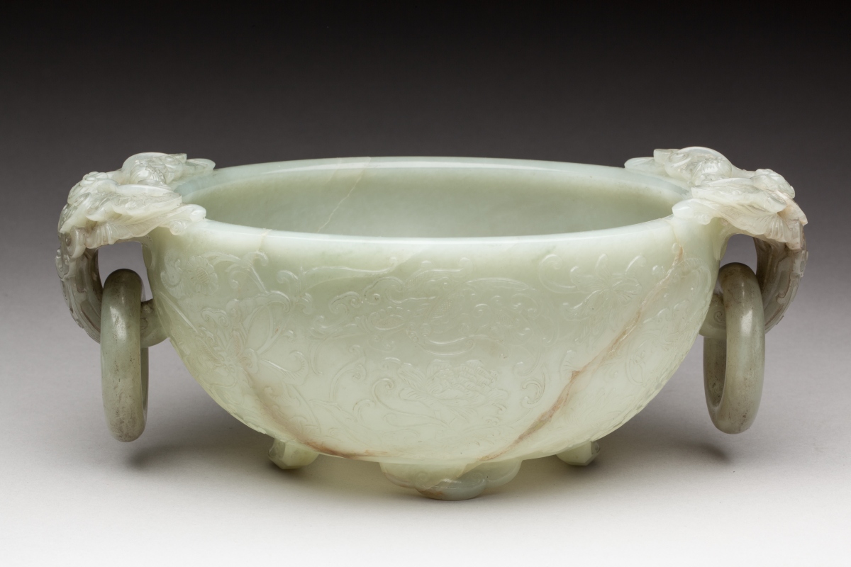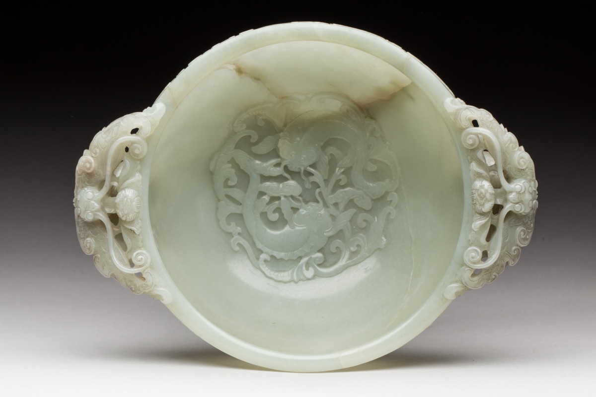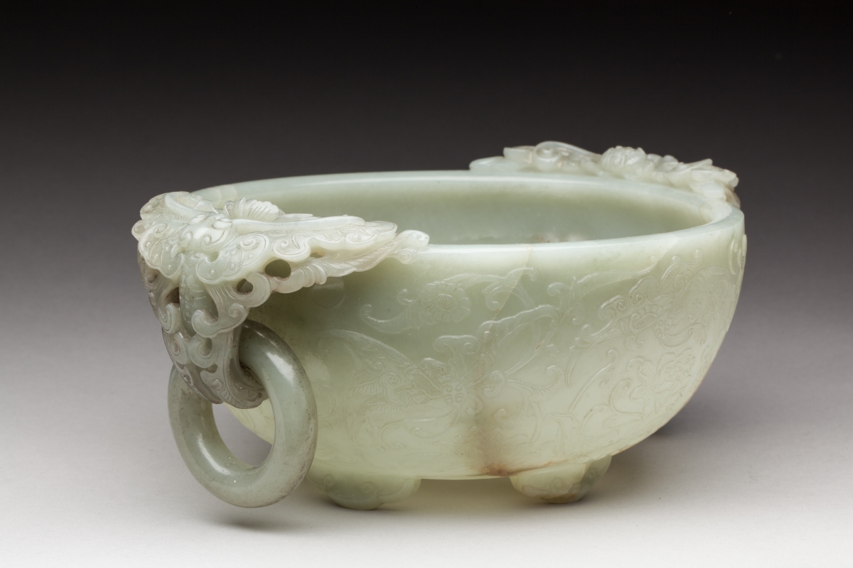 COUPE ronde en néphrite céladon finement sculptée de lotus et de papillons, le fond orné en relief de deux carpes parmi les rinceaux et les lingzhi. Les deux anses figurant des papillons aux longues antennes et des fleurs, supportant des anneaux mobiles.