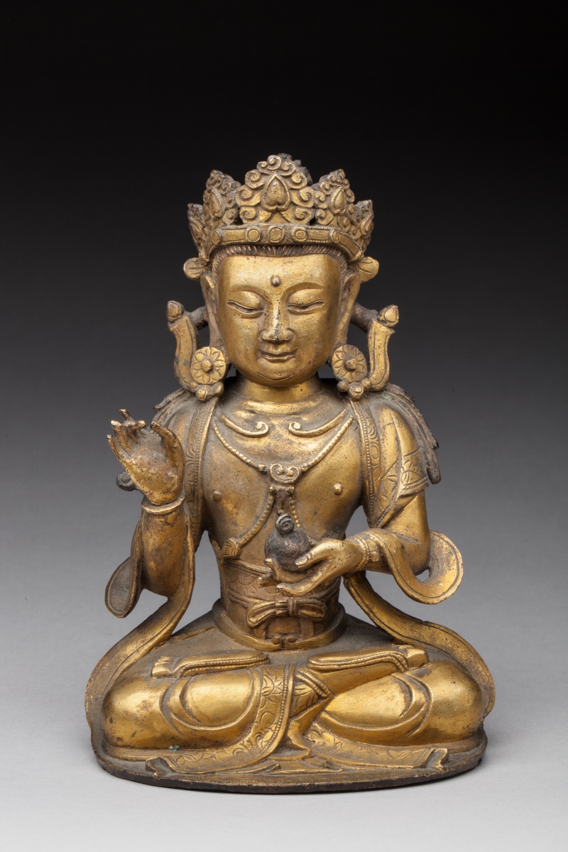 STATUETTE en bronze doré du bouddha Maitreya assis en padmasana, la main droite en karana mudra (geste qui repousse les démons), la main gauche tenant le joyau précieux, la tête ornée d'une couronne, les yeux semi-ouverts esquissant un léger sourire, un collier pendant le long de son buste.