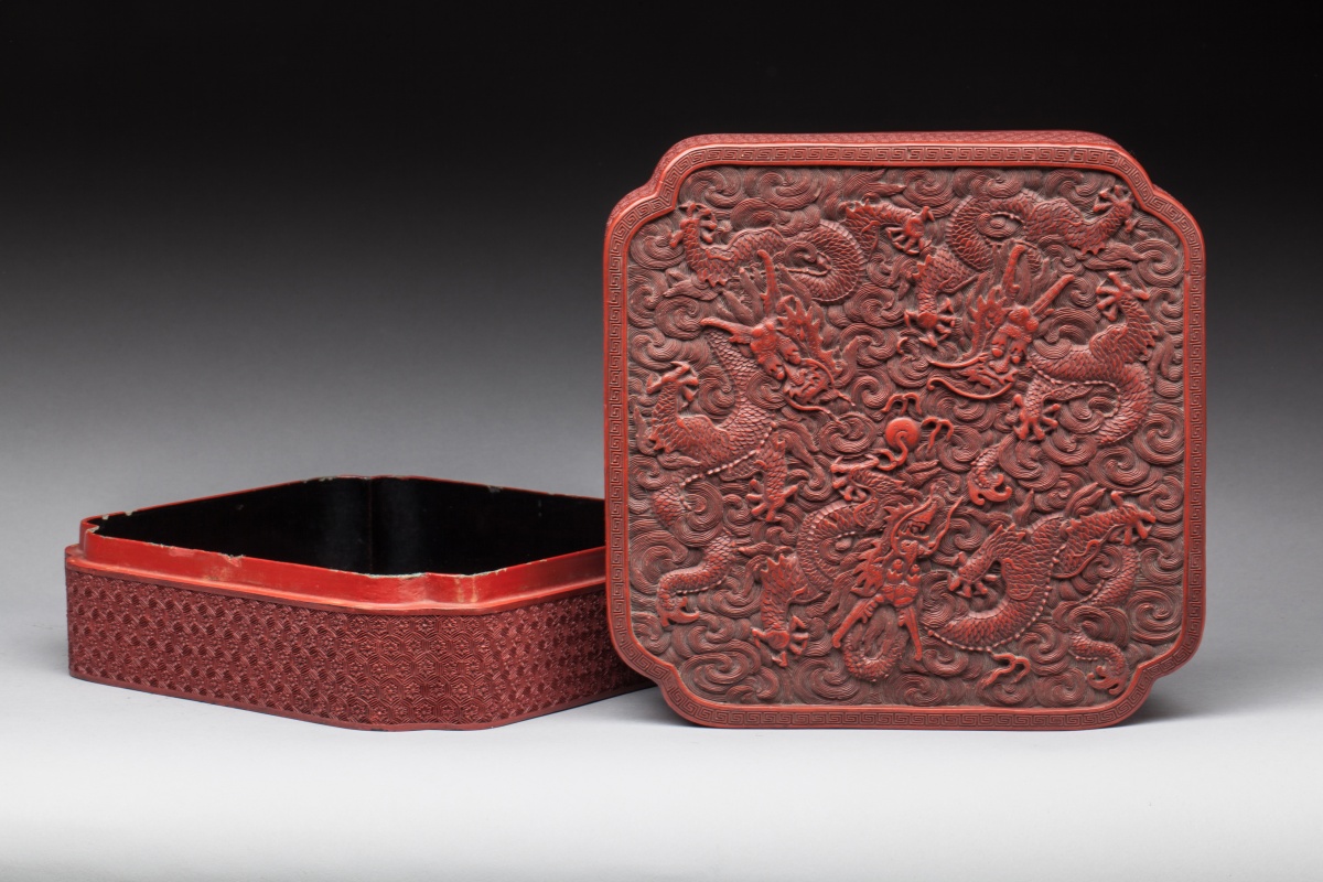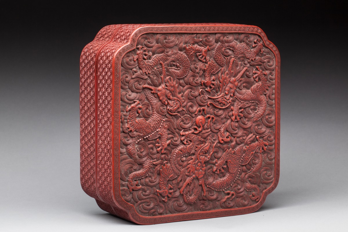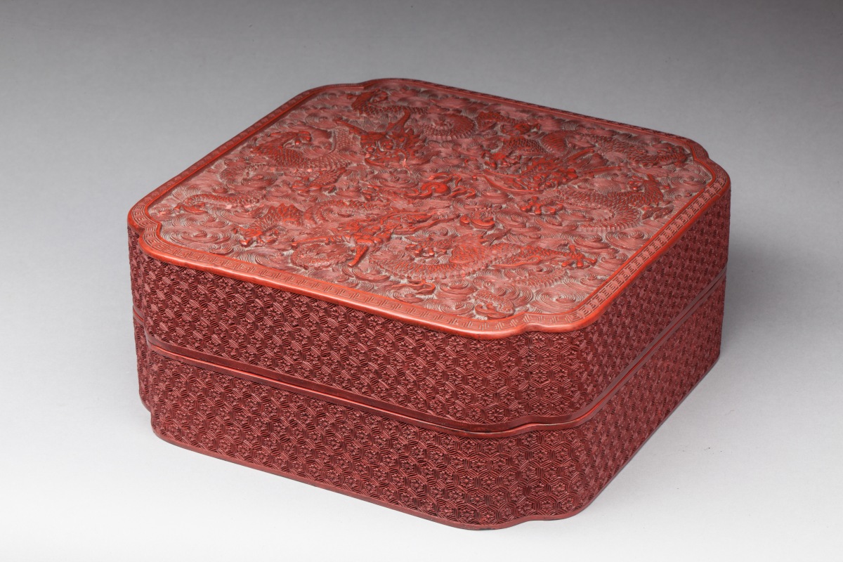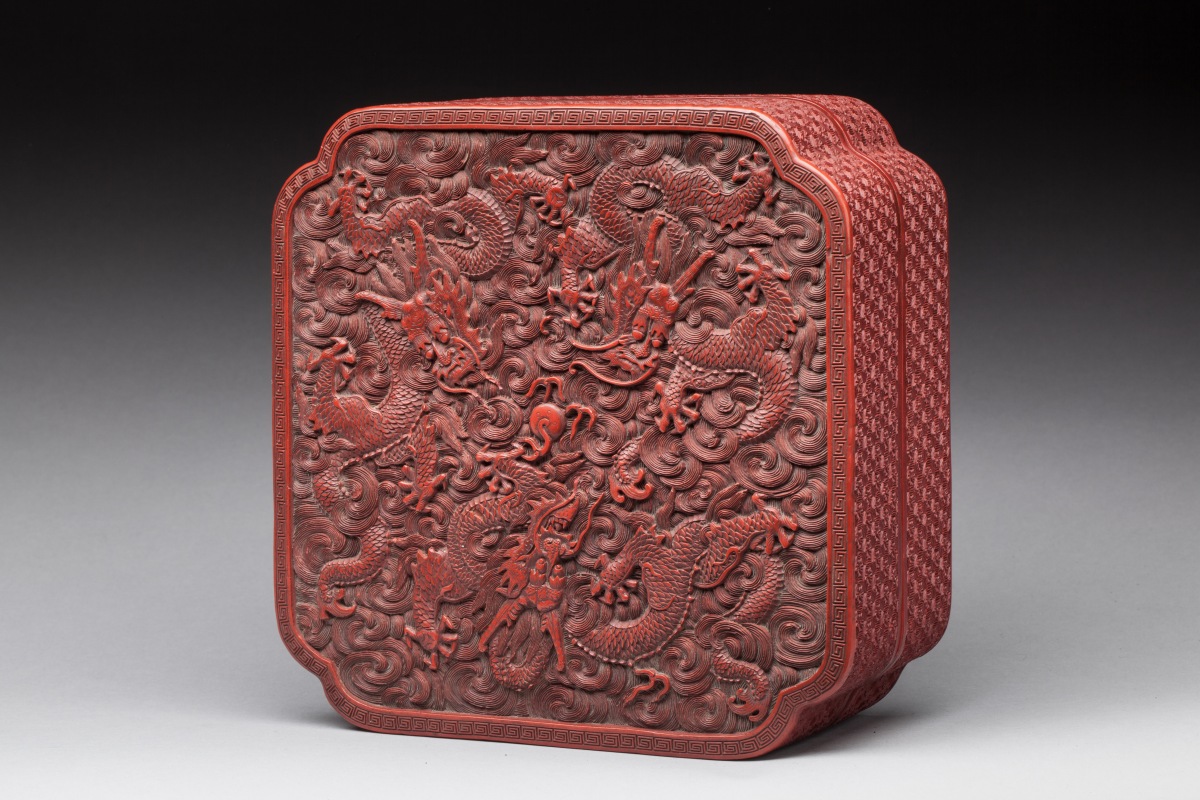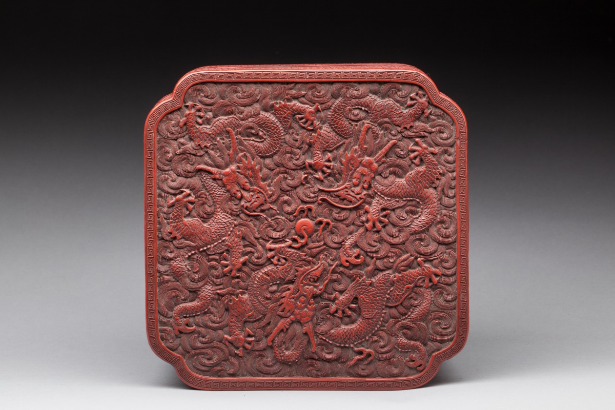 CHINA. Square red lacquered and carved BOX ornamented with dragons chasing the pearl. Qianlong period.