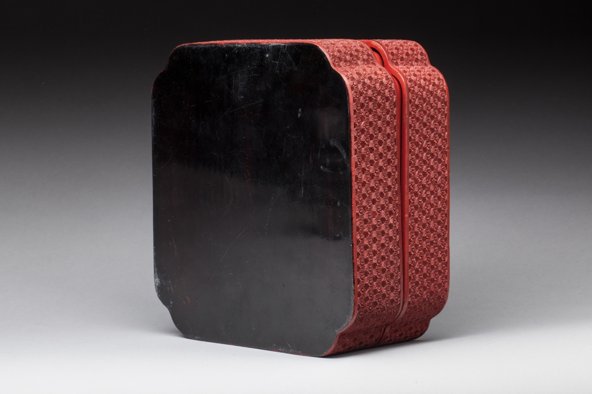 BOÎTE de forme quadrangulaire en laque rouge sculpté dit de Pékin, à décor de trois dragons dans des nuages, tournoyant autour de la perle. Les côtés sur fond de motifs géométriques à décor floral dans des compartiments hexagonaux traités en pastille.