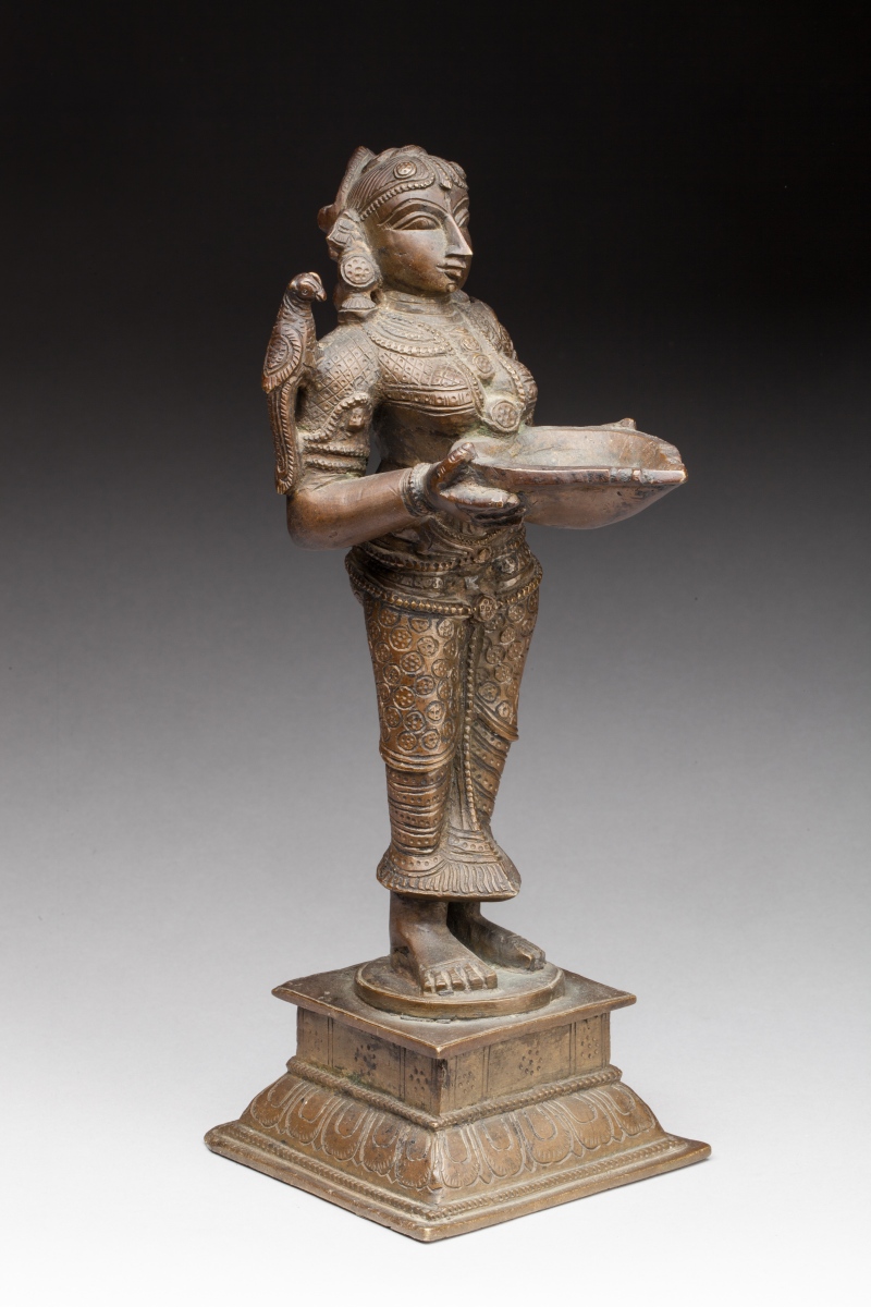 Belle lampe d'autel modelée en forme de la déesse, épouse de Vishnu, debout dans l'attitude de la triple flexion (tribhanga) sur un lotus épanoui, tenant la coupe à huile de ses deux mains. On notera la présence d'un perroquet reposant sur son épaule faisant écho aux plus anciennes représentations indiennes de divinités féminines associées à la nature.