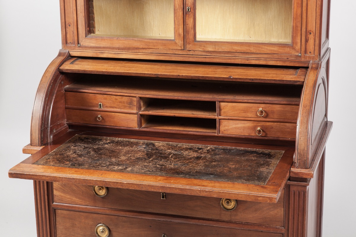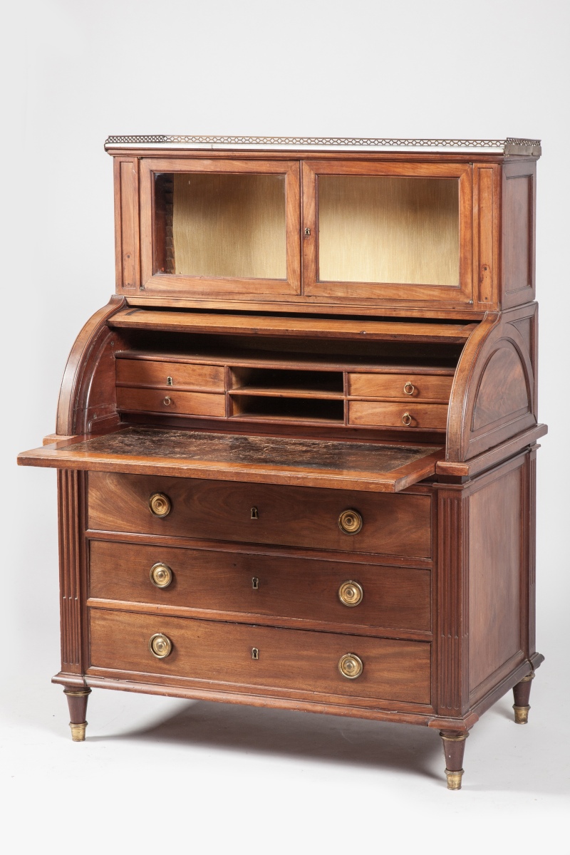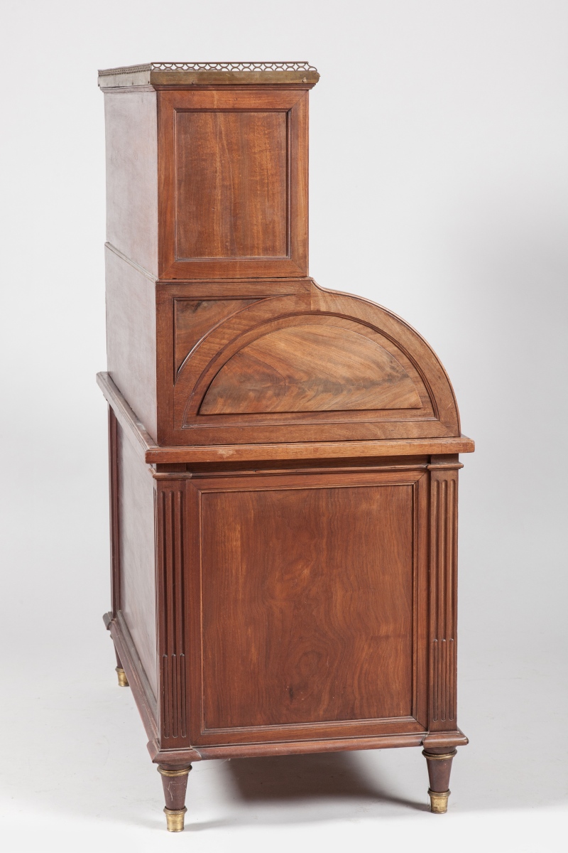BONHEUR DU JOUR en acajou, toutes faces. Il présente un gradin ouvrant à deux vantaux vitrés surmonté d'un marbre blanc entouré par une galerie de laiton ajourée. Un cylindre découvre trois tiroirs dont un formant coffre et deux casiers. Une tablette coulissante sert d'écritoire. Le caisson, en partie inférieure ouvre à trois rangs de tiroirs. Montants droits cannelés simulant des pilastes. Pieds toupies.