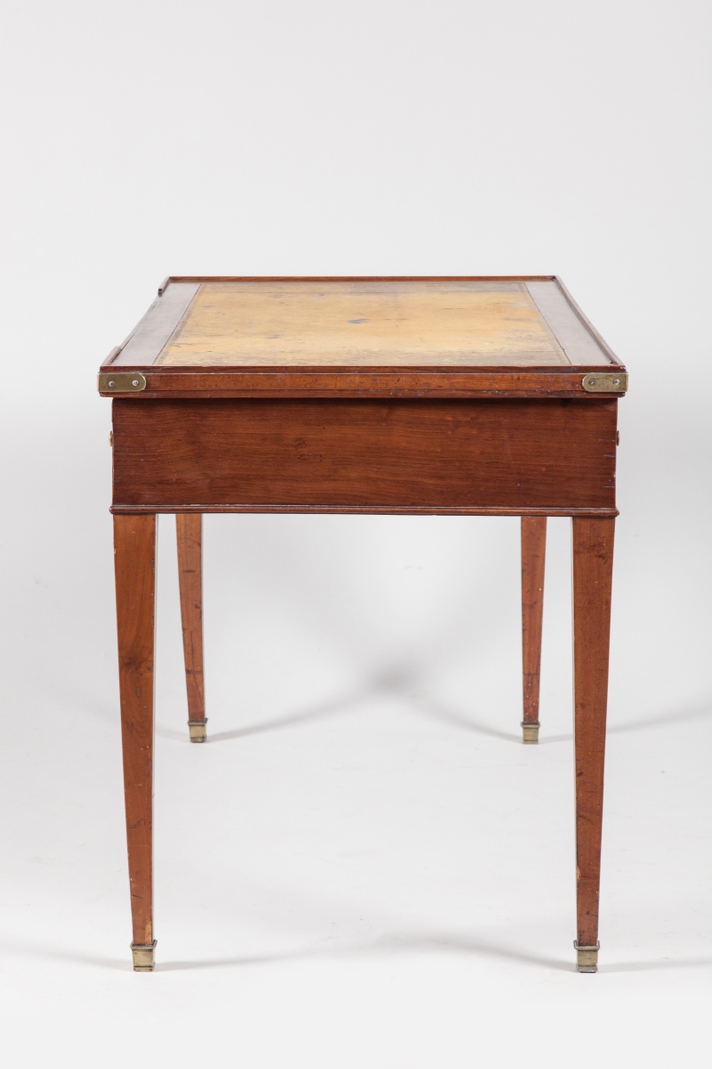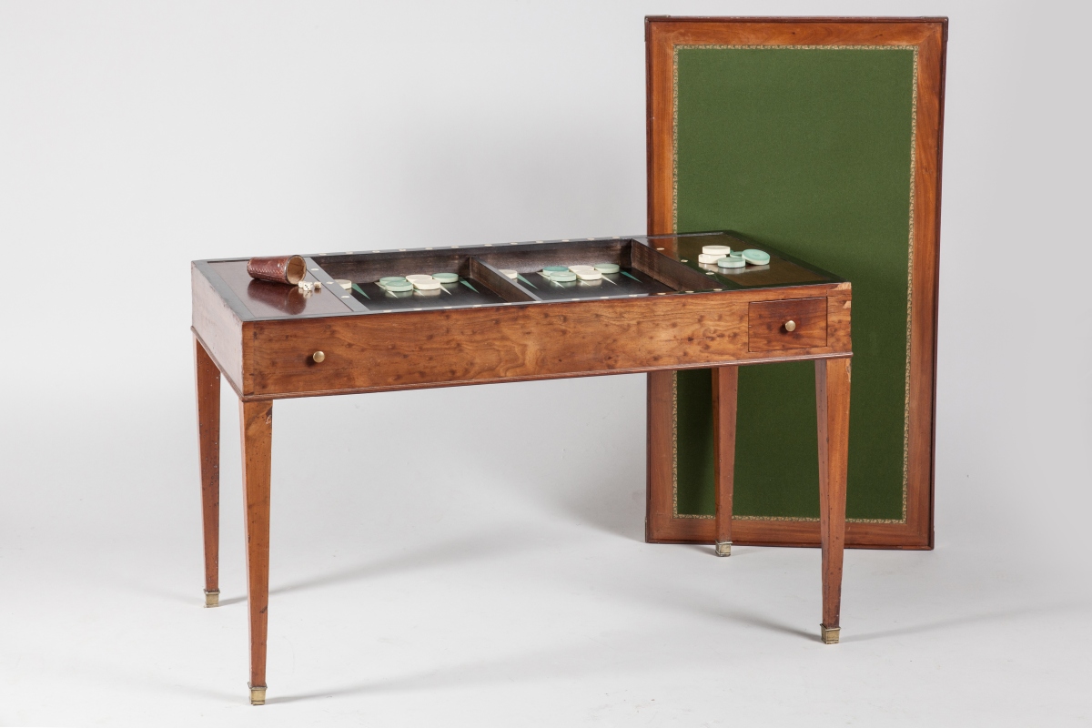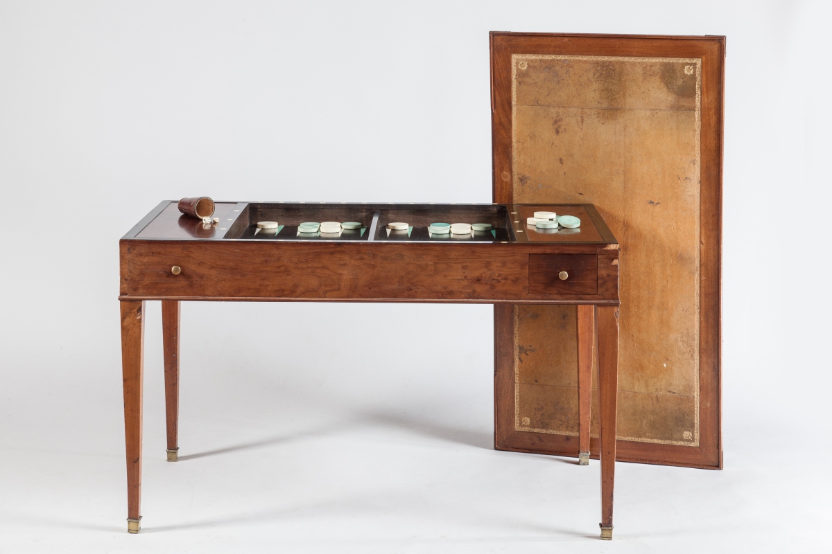 TABLE TRIC-TRAC de forme rectangulaire en acajou et placage d'acajou. Plateau mobile gainé d'un cuir fauve moderne à roulettes sur une face - et recouvert sur l'autre face d'un feutre vert moderne. Il découvre un intérieur plaqué d'ébène, bois noirci, ivoire et bois teinté vert. Ceinture ouvrant à quatre tiroirs dont deux simulés. Pieds gaines avec sabots en bronze doré.