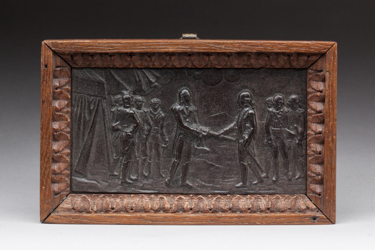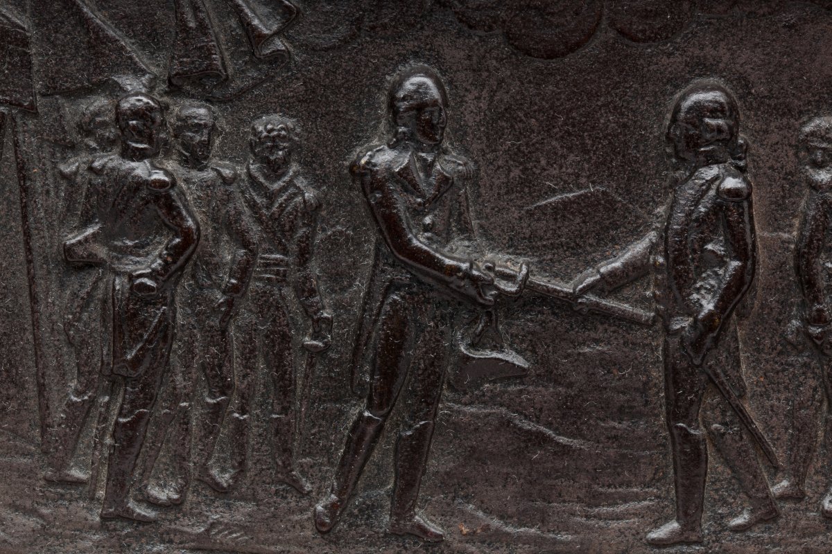 Cette plaque pourrait représenter soit la reddition de Cornwallis remettant son épée, soit plus vraisemblablement Washington récompensant La Fayette ou Rochambeau.