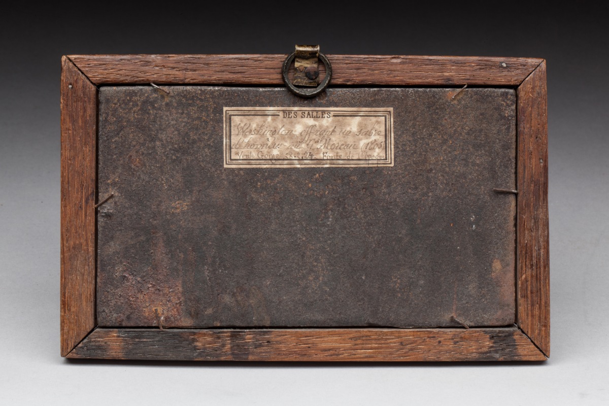 Au revers une étiquette porte une inscription manuscrite à l'encre noire " Washington offrant un sabre d'honneur au général Moreau (1805). Vente Gorge 28.2.24. Fonte de l'époque ". Manifestement il s'agit d'une erreur: Washington meurt le 14 décembre 1799, et Moreau après sa disgrâce en 1804 en raison de son implication dans le complot ourdi par Cadoudal contre Bonaparte, n'arrive aux Etats Unis qu'en 1805.
