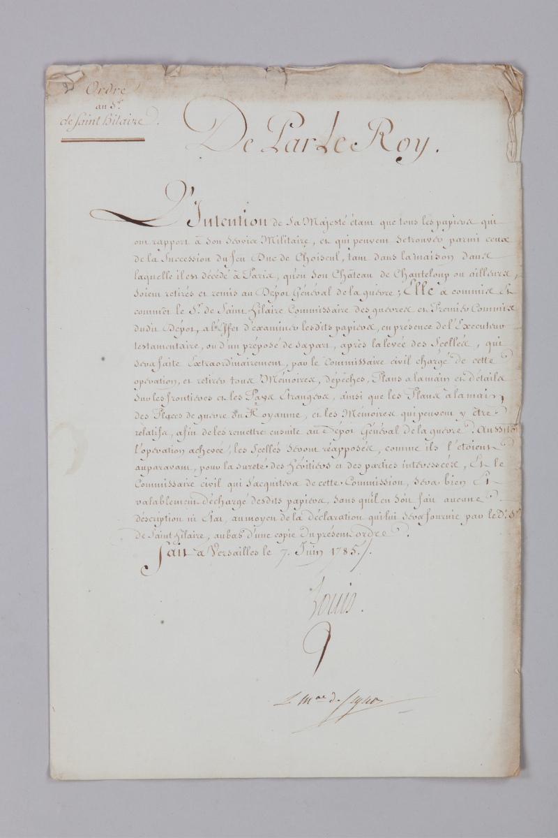 Ordonnance du roi qui donne ordre à M. Saint-Hilaire de procéder à la saisie des papiers ayant appartenu au duc de Choiseul, décédé le 8 mai 1785. L'intention de Sa Majesté étant que les papiers qui ont rapport à son service militaire, et qui peuvent se trouver parmi ceux de la succession du feu Duc de Choiseul, tant dans la maison dans laquelle il est décédé à Paris, qu'en son château de Chanteloup ou ailleurs, soient retirés et remis au dépôt général des guerres.