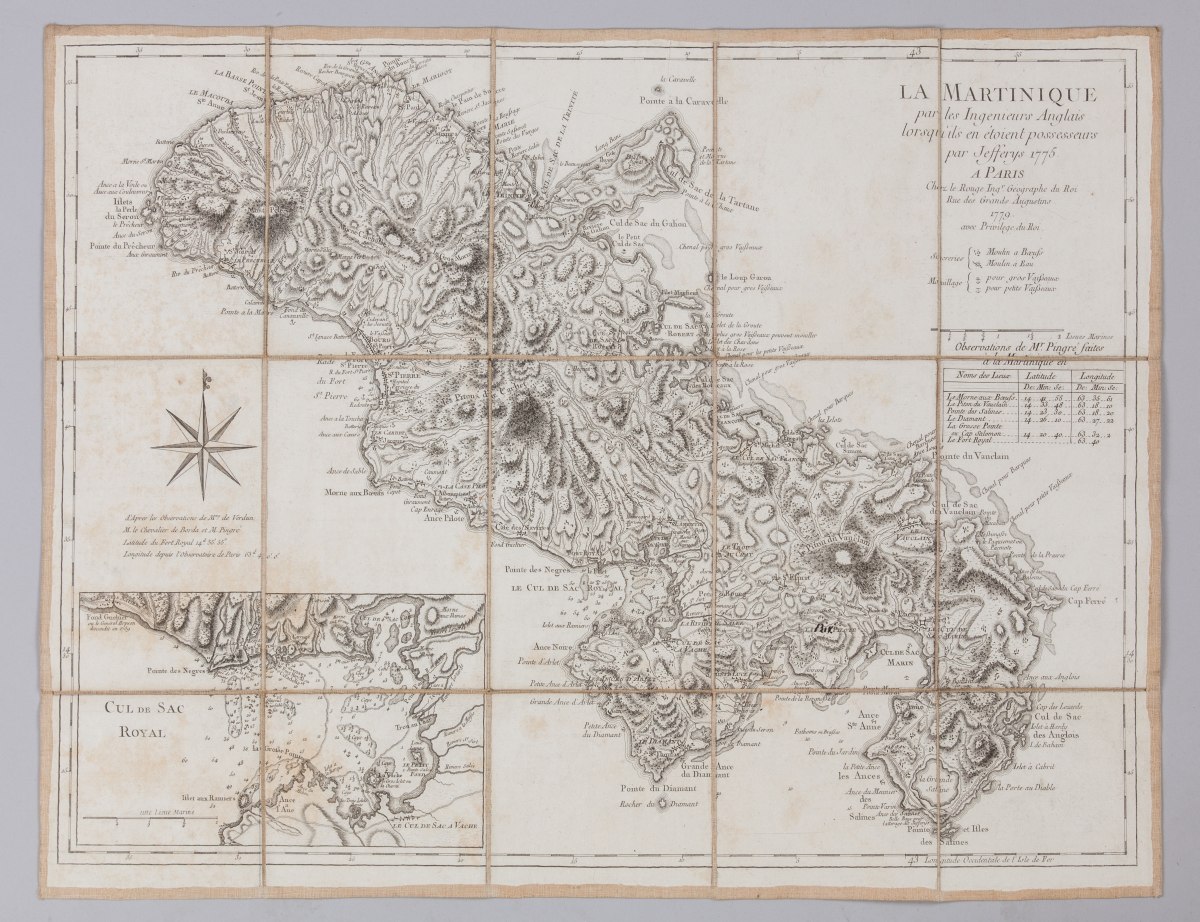 Joint: " a Martinique par les ingénieurs anglais lorsqu'ils en étaient possesseurs par Jefferys 1775". Gravure. A Paris. Chez Le Rouge. 1779. En 15 sections montées sur toile et pliées, formant une carte de 62 x 48 cm. Tâches jaunâtres.