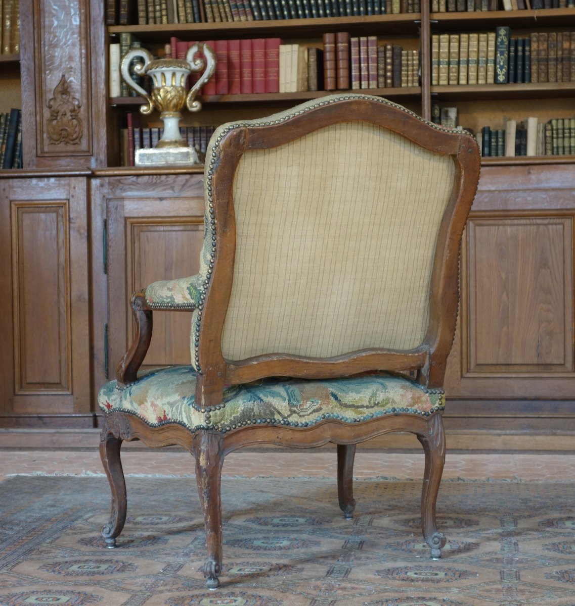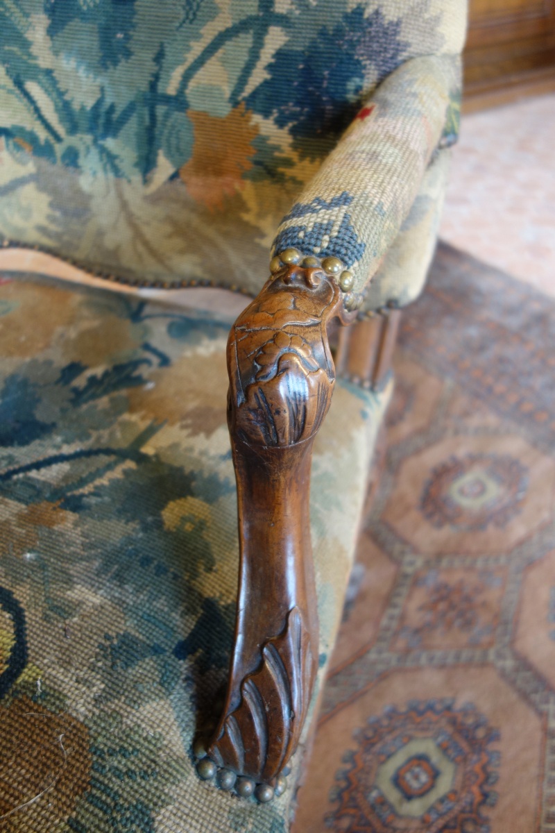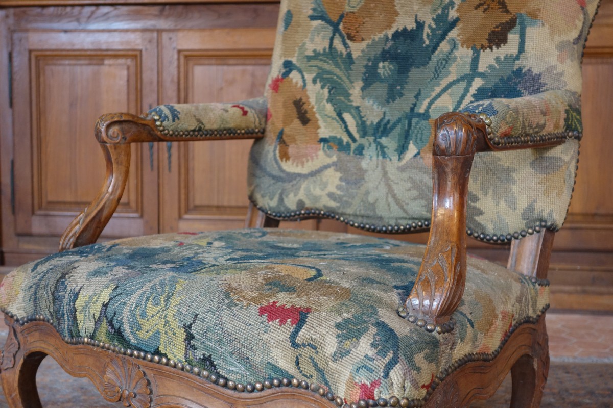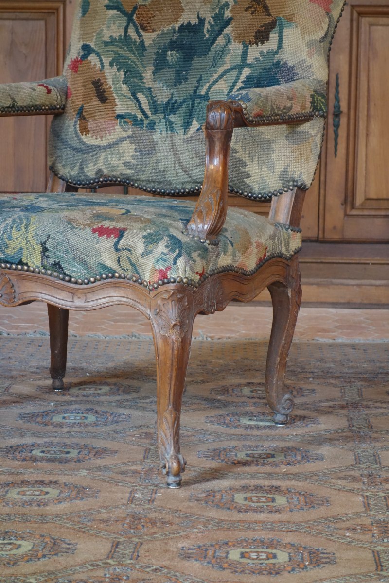 FAUTEUIL À LA REINE à haut dossier en noyer mouluré et sculpté. Le dossier est légèrement découpé, les accotoirs sont à manchette, les consoles d'accotoir en coup de fouet ornées de feuillages. La ceinture chantournée est centrée d'une coquille. Il repose sur quatre pieds galbés ornés de coquilles et terminés en enroulement.