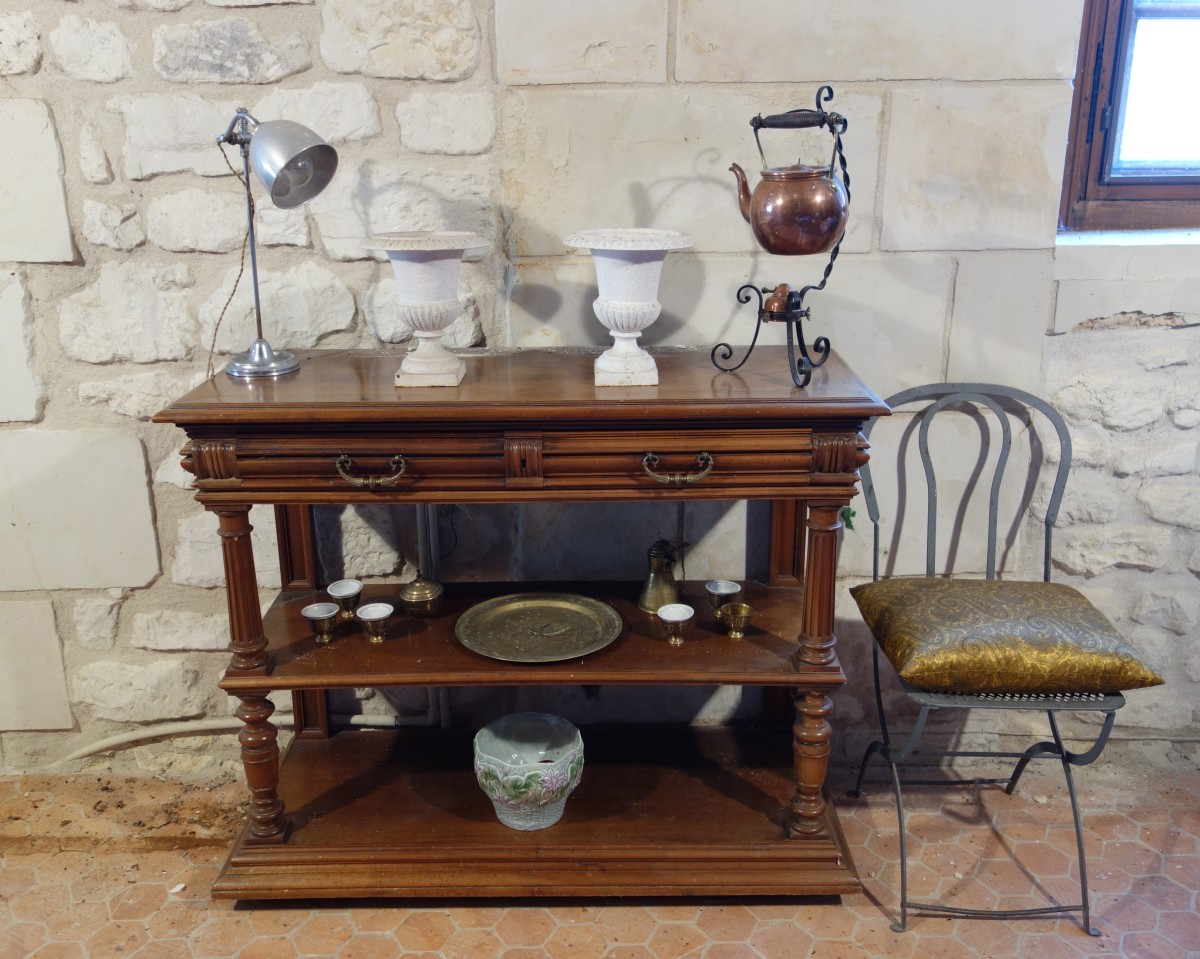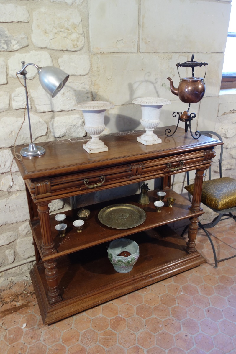 DESSERTE en bois naturel de forme rectangulaire à trois plateaux. Elle ouvre par deux tiroirs en ceinture. Les piliers antérieurs de section ronde sont cannelés en partie supérieure, tournés en partie inférieure.
