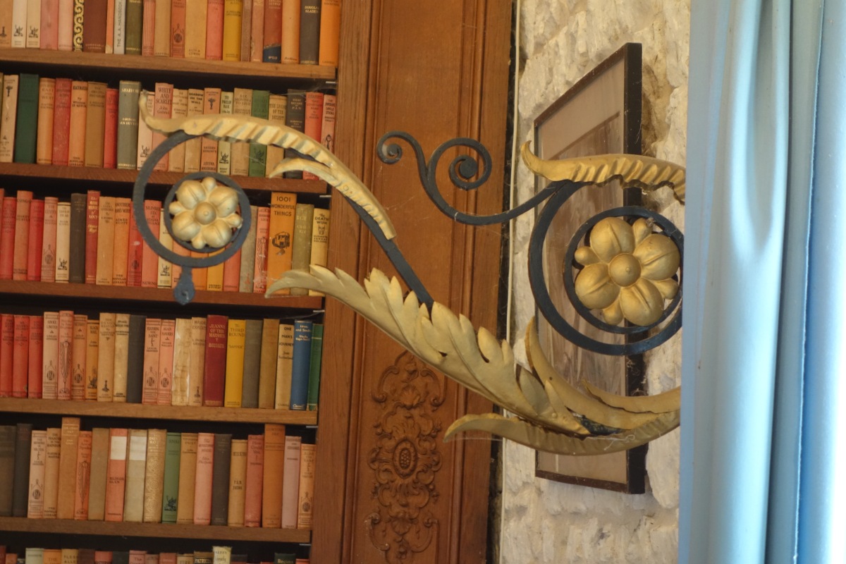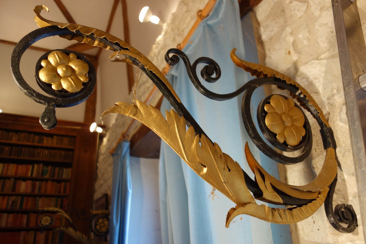 Deux PORTES ENSEIGNES en fer forgé et métal doré ajouré à motif de fleurs et feuillages.