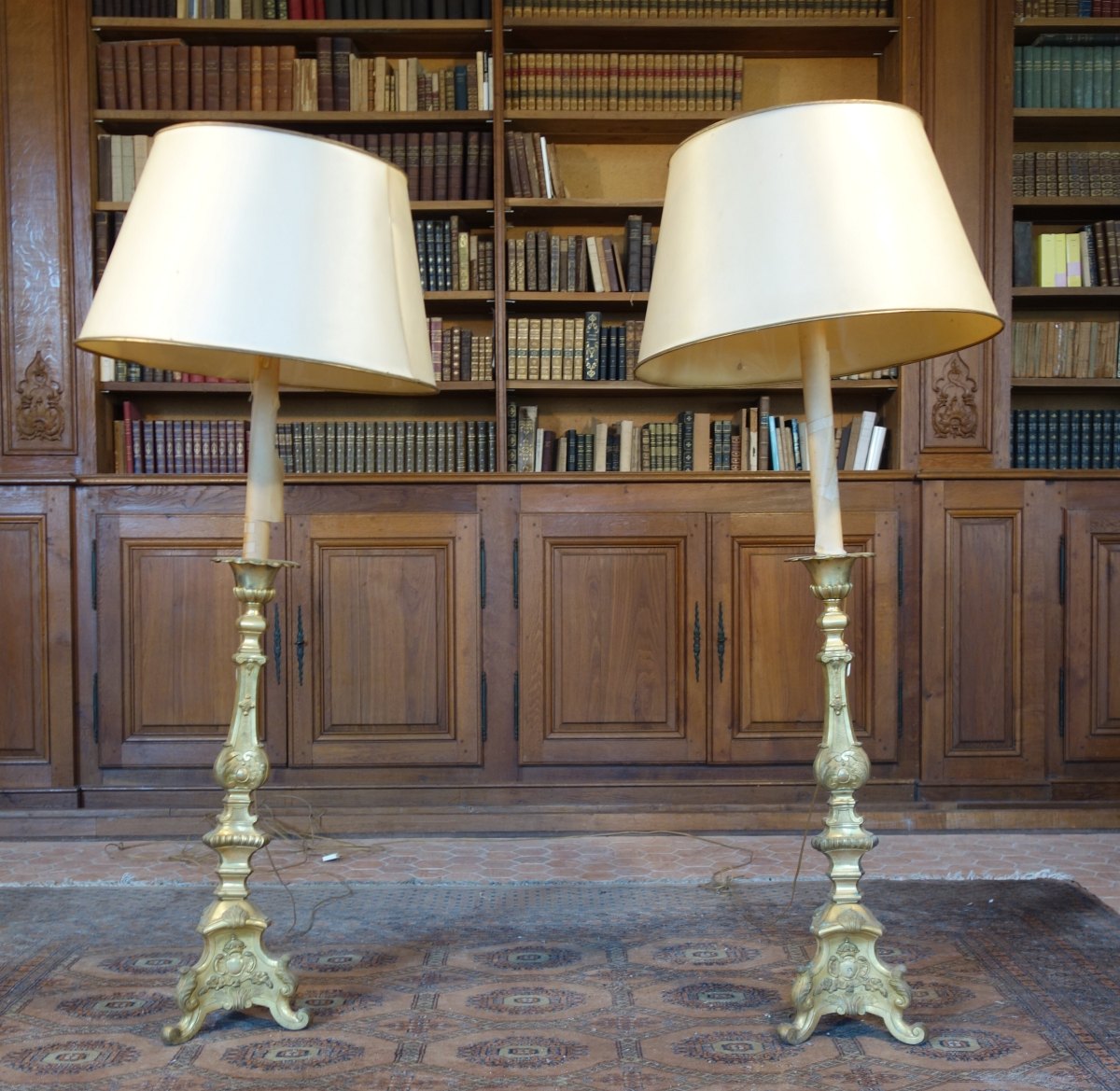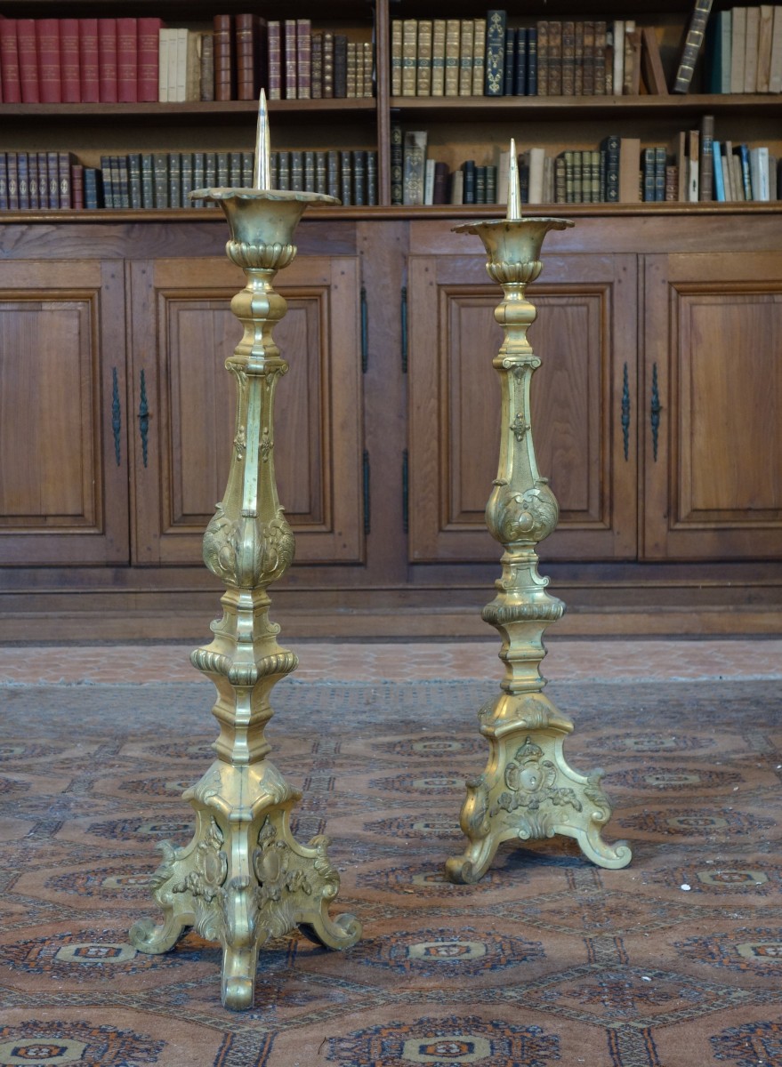 Paire de PIQUE-CIERGES en métal doré (bronze?) de forme architecturée.