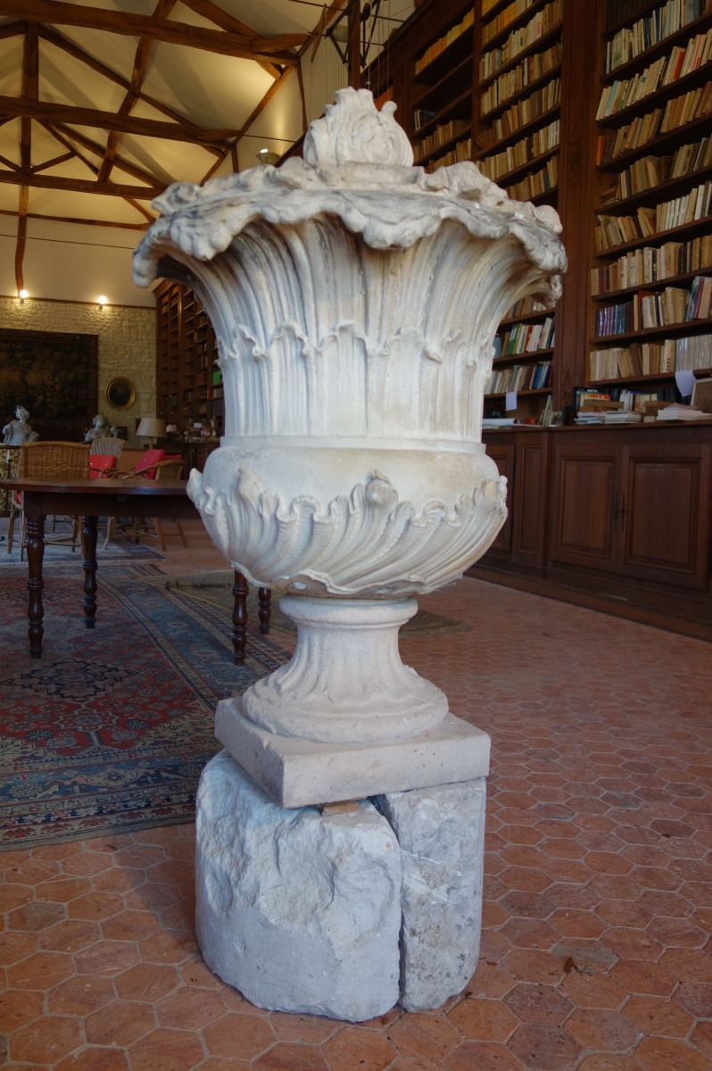 VASE MÉDICIS COUVERT en terre cuite. Couvercle à décor de feuillages en haut relief, prise en bouton de fleur. Col chantourné, panse ornée de feuillages. Base circulaire reposant sur un socle carré.