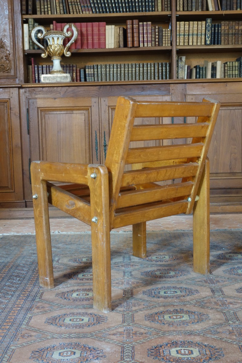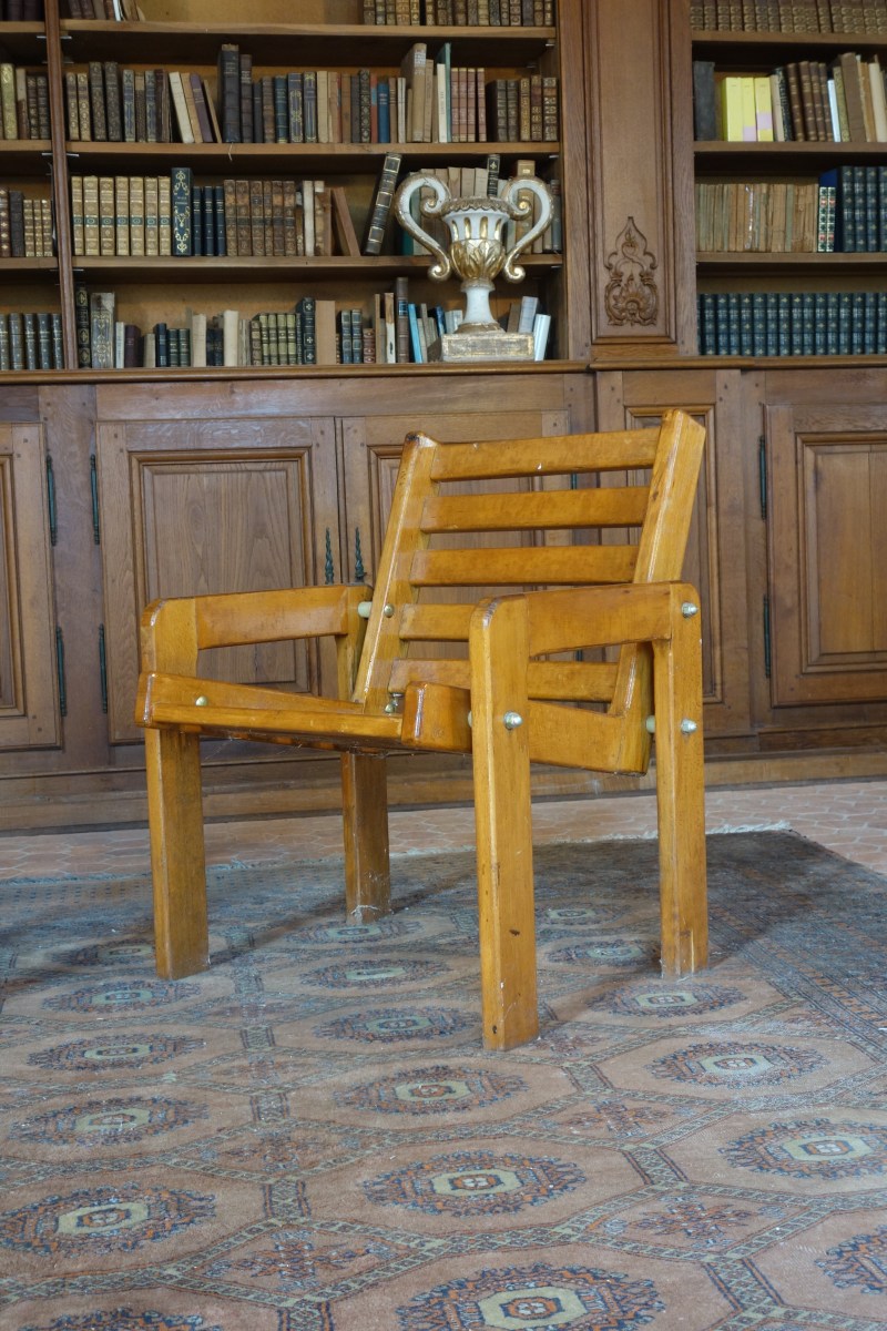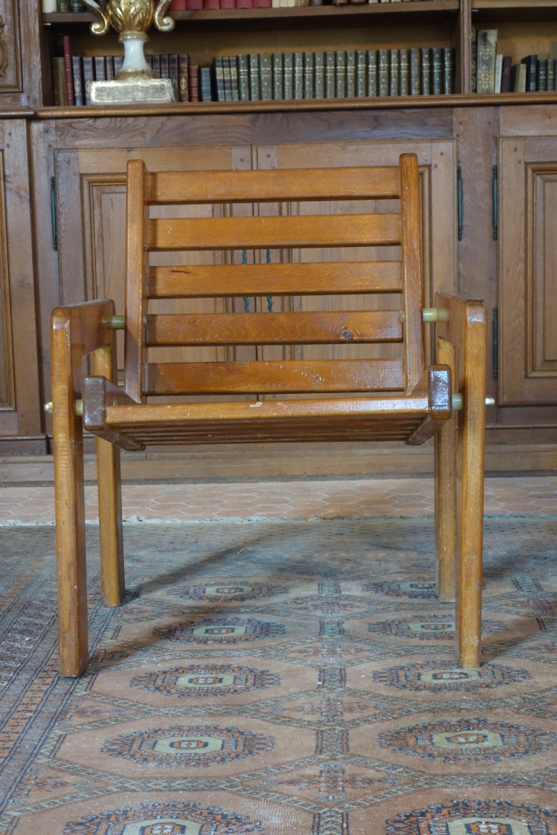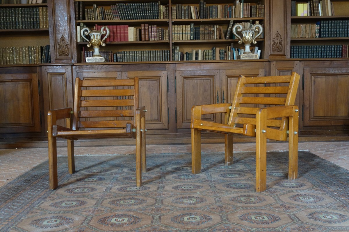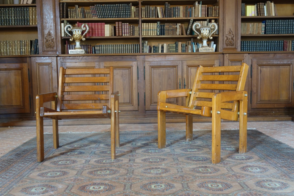 - PAIRE de FAUTEUILS en bois clair. Dossier incliné et ajouré. Piètement en U. Milieu du XXe. Haut. 84, Larg. 70, Prof. 70 cm.