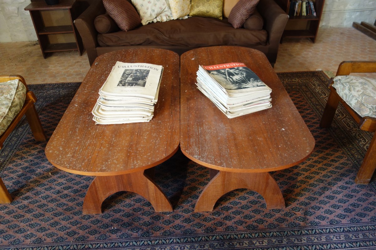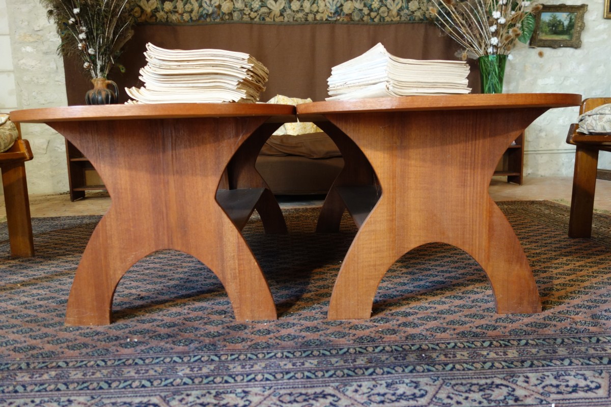 - Deux TABLES BASSES en bois. Plateau ovale. Piètement en X. XXe.