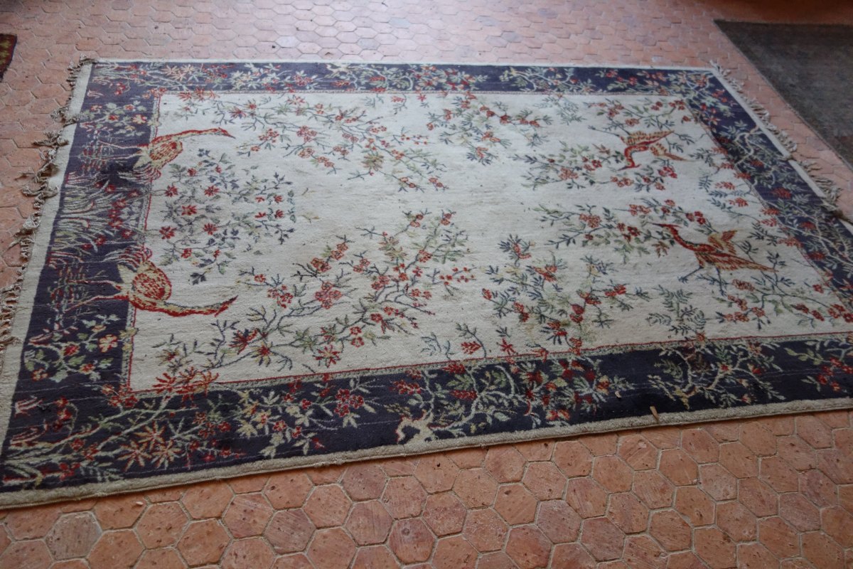 - l'autre à fond blanc à décor de grues. Bordure bleue ornée de fleurs. Env. 200 x 300 cm.