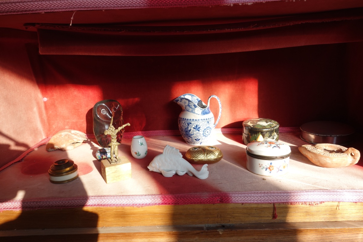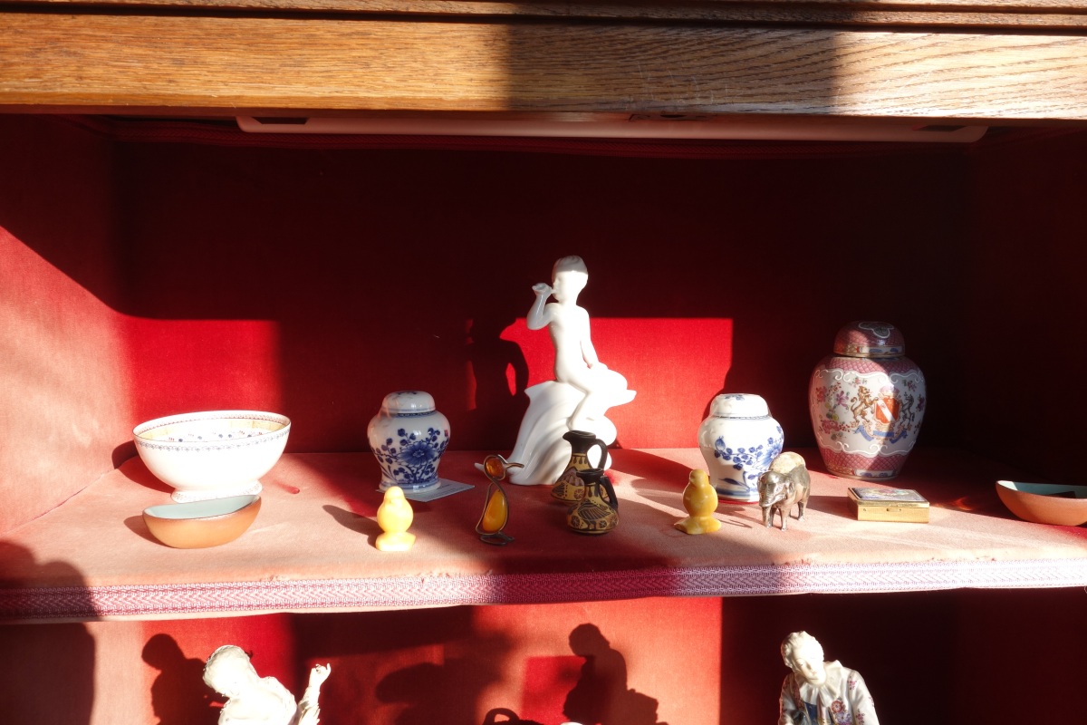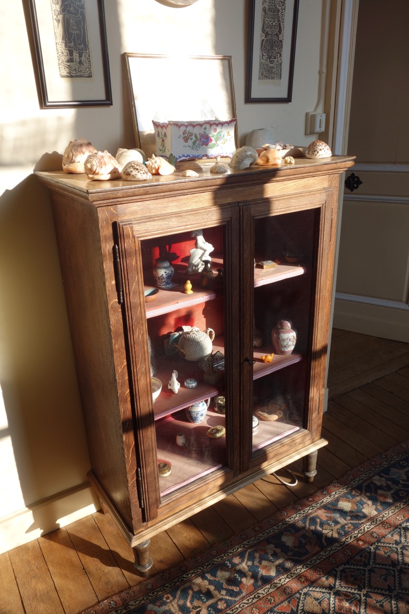 Petite VITRINE en bois naturel mouluré ouvrant par deux portes et son CONTENU de bibelots et céramiques, notamment: