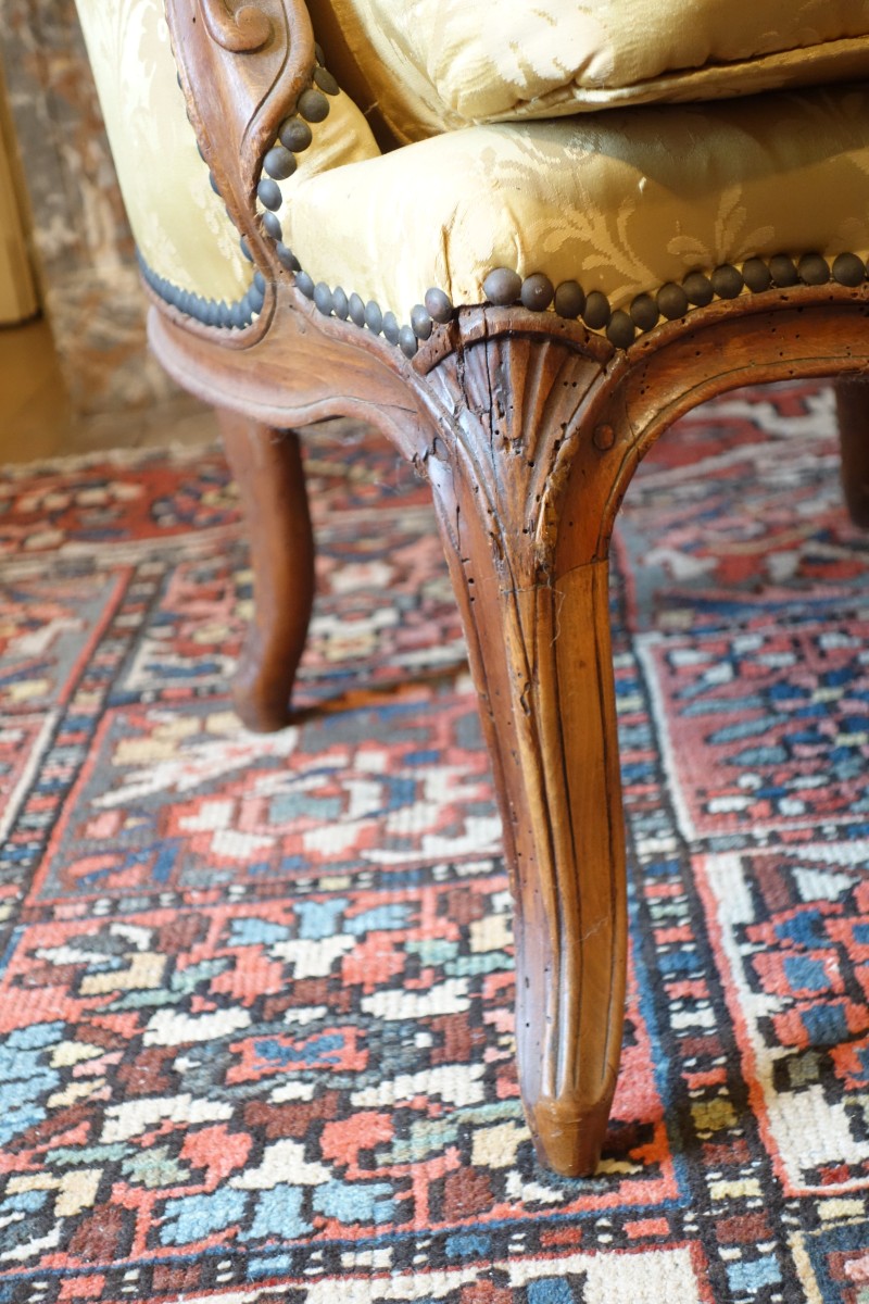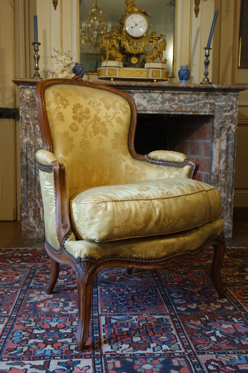 BERGÈRE en hêtre mouluré et sculpté de motifs feuillagés. Le dossier violoné est orné d'une fleur à l'amortissement, les consoles d'accotoir et les pieds sont galbés.