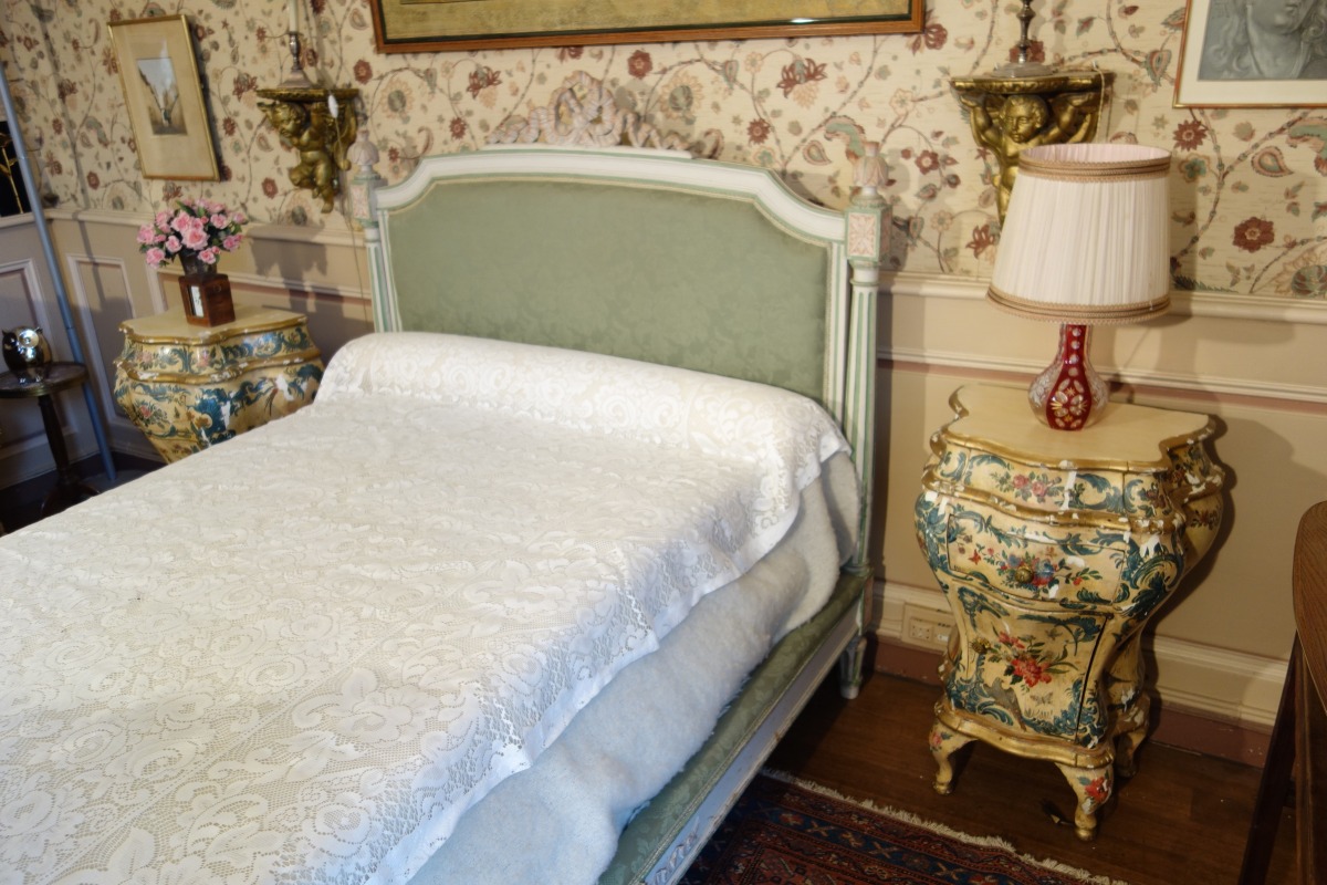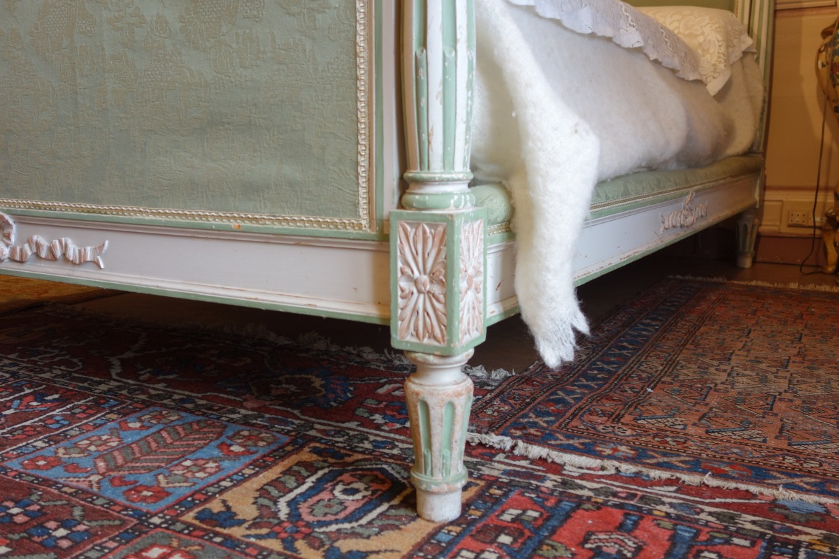 LIT en bois mouluré, sculpté et laqué blanc, rose et vert. Garniture de soie verte.