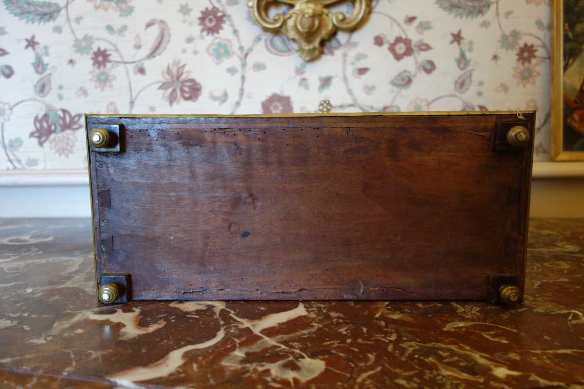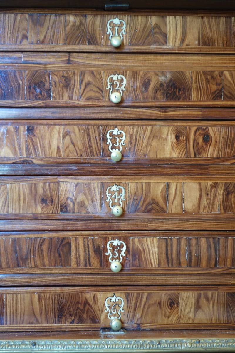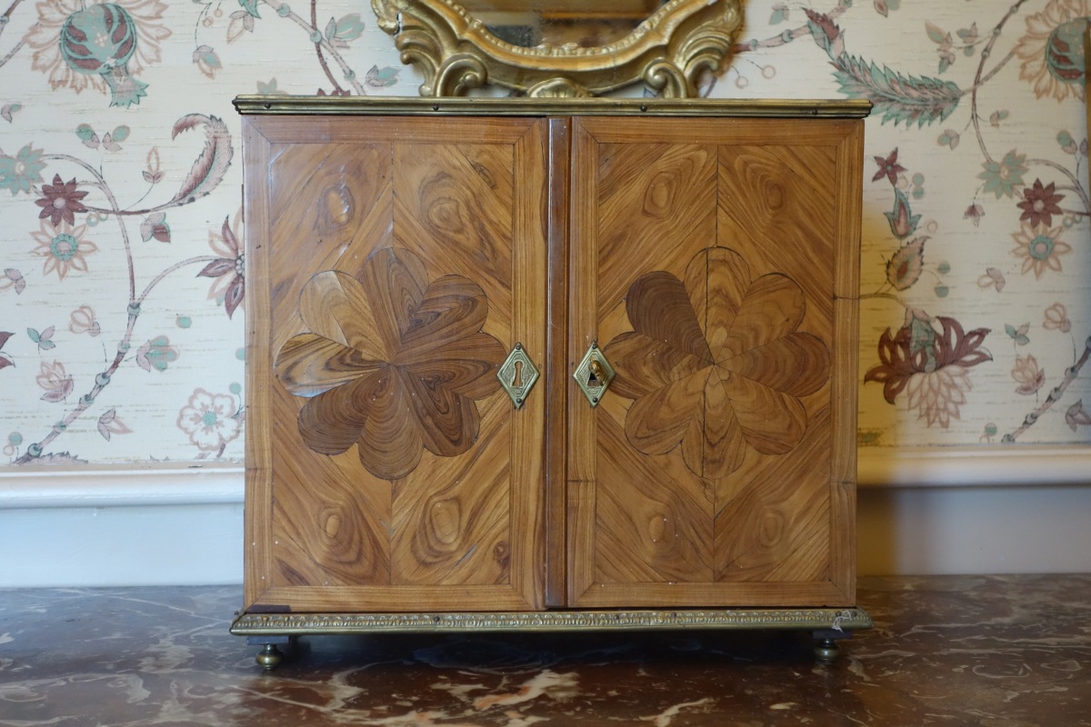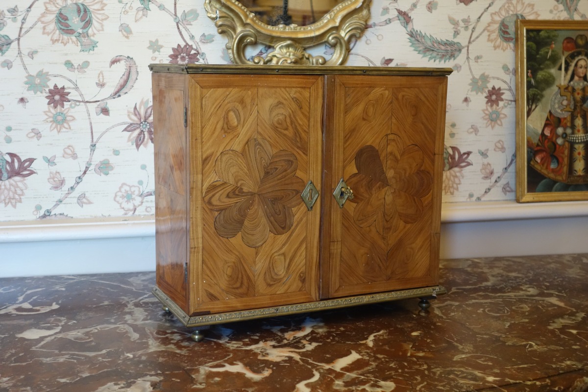 Petit MÉDAILLER en placage de bois de rose ? de forme rectangulaire ouvrant par deux vantaux marquetés de rosaces sur six tiroirs numérotés en chiffres arabes dans des médaillons feuillagés en façade. Il repose sur quatre pieds toupie réunis par une lingotière métallique à feuilles