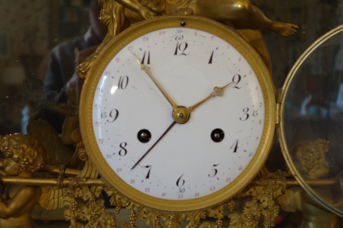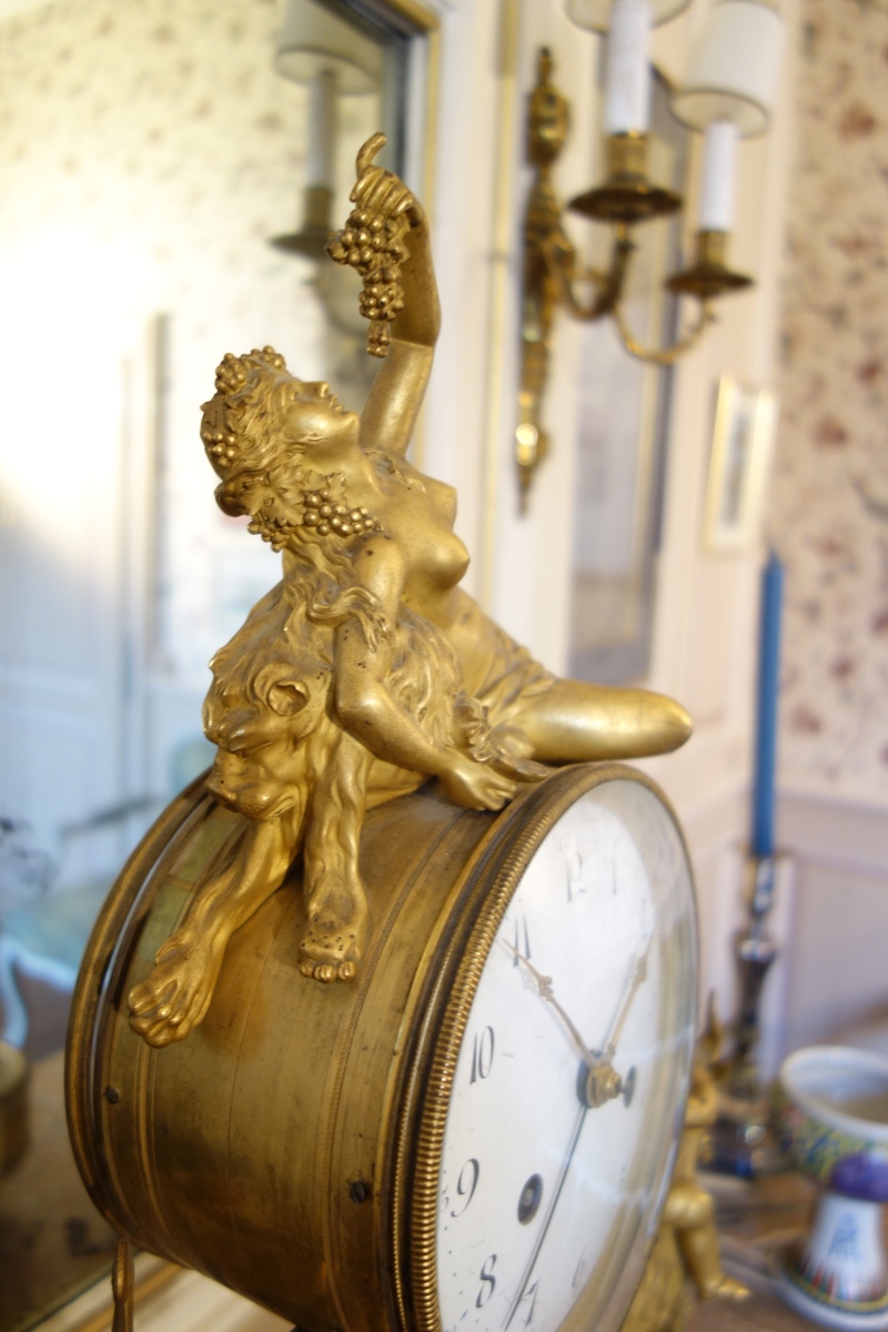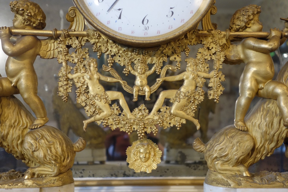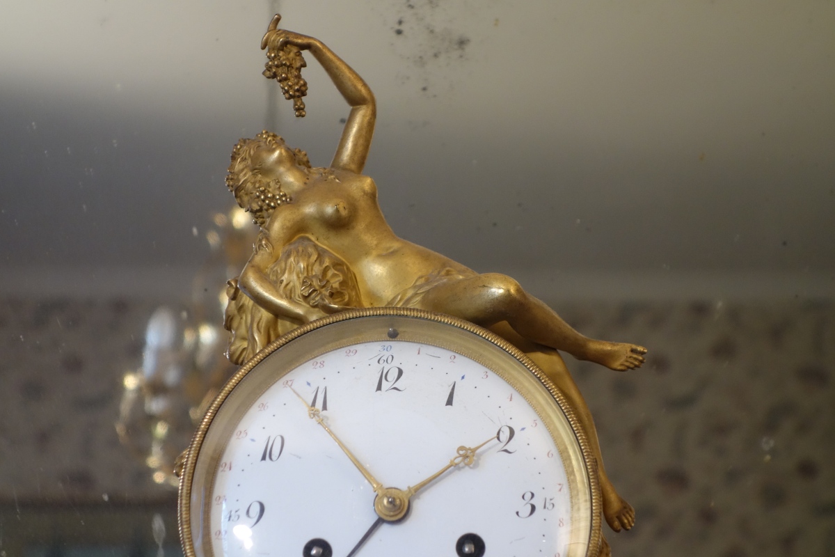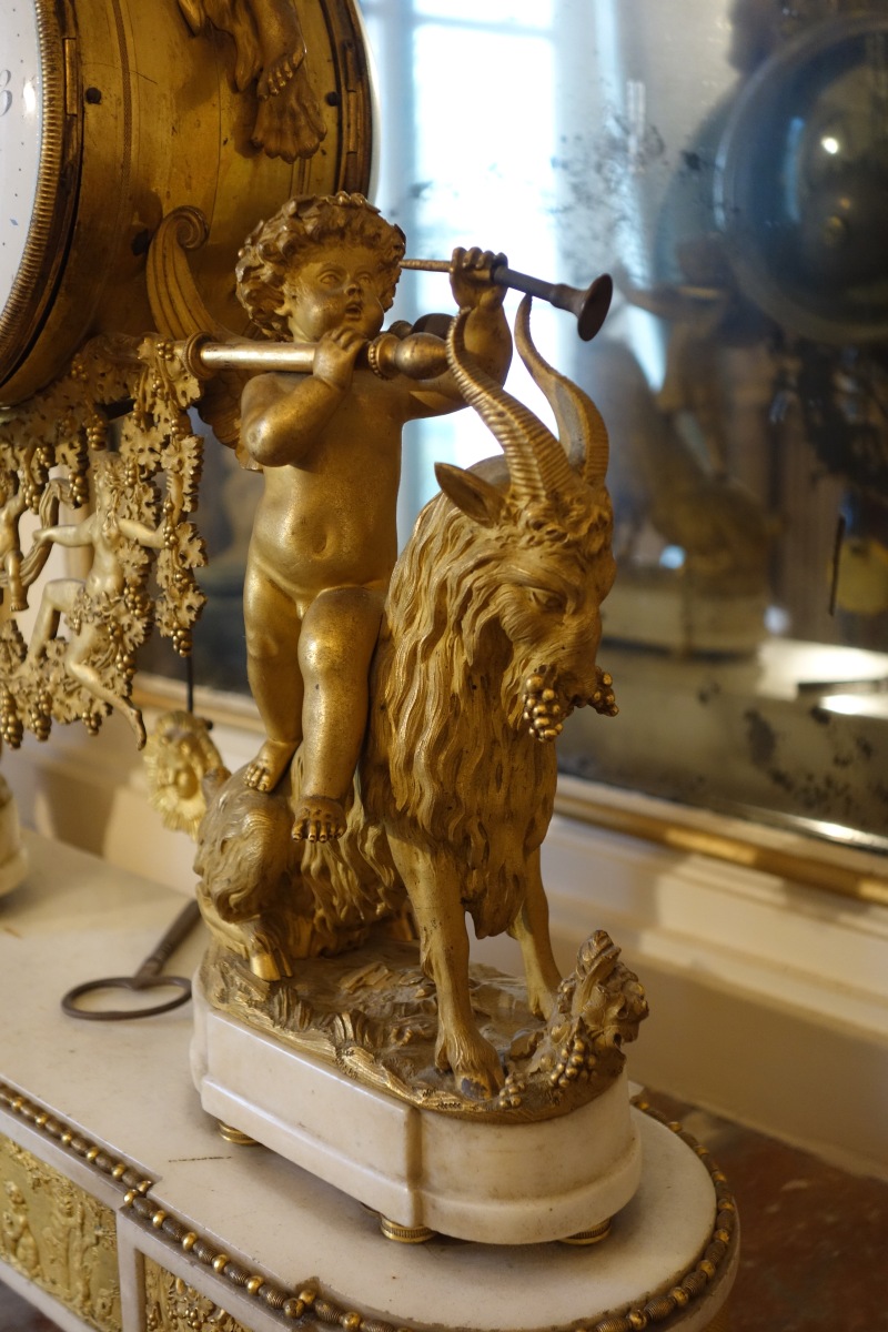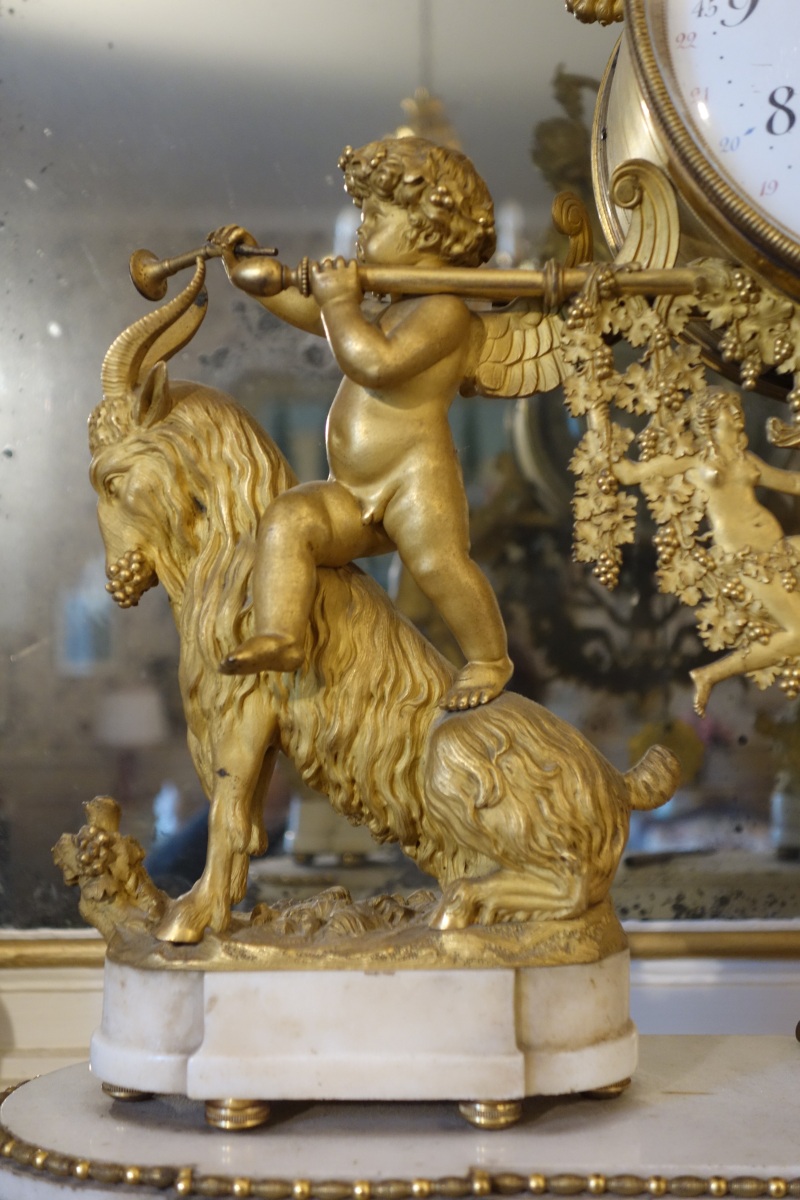 PENDULE À LA BACHANTE en bronze doré sur un socle de marbre blanc à ressauts. Une bacchante allongée sur le cadran et adossée à une peau de lion tient dans sa main gauche une grappe de raisins. Le cadran circulaire est émaillé en noir, rouge et bleu avec les heures et les mois en chiffres arabes. Les gradués pour les minutes. Il est porté par deux angelots montés sur des boucs et sonnant dans une trompette. Le balancier à tête de soleil rayonnant. Une guirlande de pampres sert de balançoire à deux bacchantes et à un putti. Le socle de marbre est orné d'un bas-relief figurant des putti bachiques et des têtes de faunes. Il repose sur quatre pieds toupie. Le mécanisme est protégé par un écran de verre bombé. Suspension à plaque. Fines aiguilles dorées pour les heures et les minutes et métallique pour les secondes