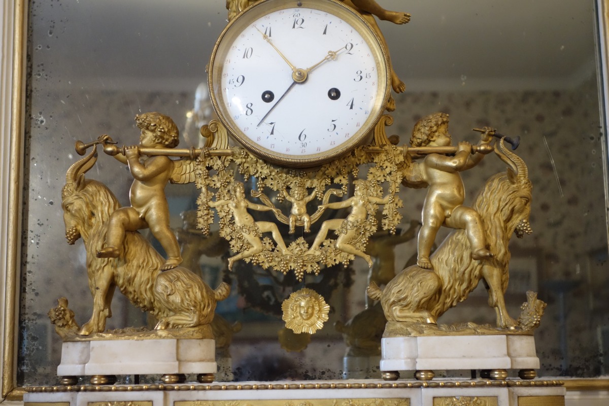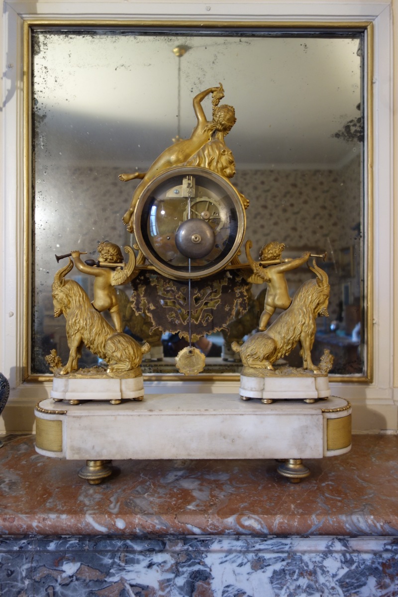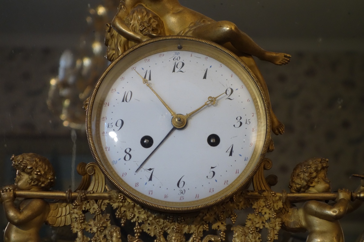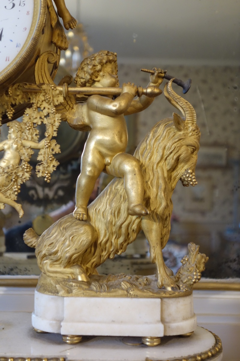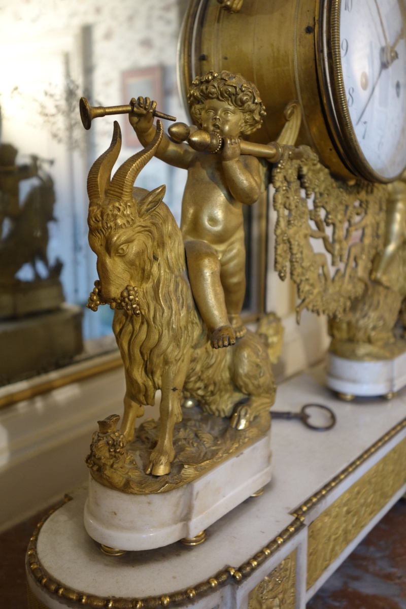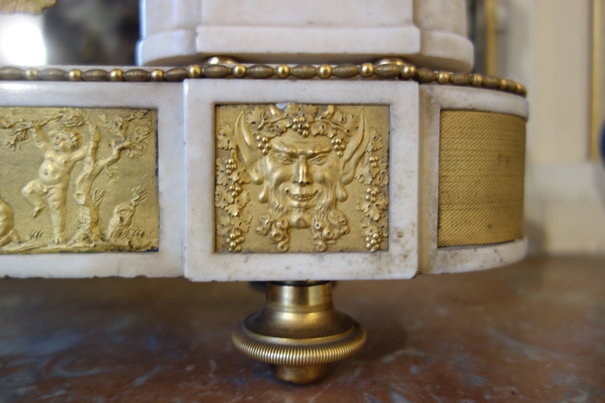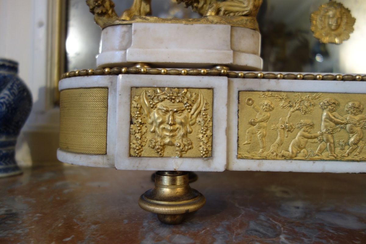 PENDULE À LA BACHANTE en bronze doré sur un socle de marbre blanc à ressauts. Une bacchante allongée sur le cadran et adossée à une peau de lion tient dans sa main gauche une grappe de raisins. Le cadran circulaire est émaillé en noir, rouge et bleu avec les heures et les mois en chiffres arabes. Les gradués pour les minutes. Il est porté par deux angelots montés sur des boucs et sonnant dans une trompette. Le balancier à tête de soleil rayonnant. Une guirlande de pampres sert de balançoire à deux bacchantes et à un putti. Le socle de marbre est orné d'un bas-relief figurant des putti bachiques et des têtes de faunes. Il repose sur quatre pieds toupie. Le mécanisme est protégé par un écran de verre bombé. Suspension à plaque. Fines aiguilles dorées pour les heures et les minutes et métallique pour les secondes