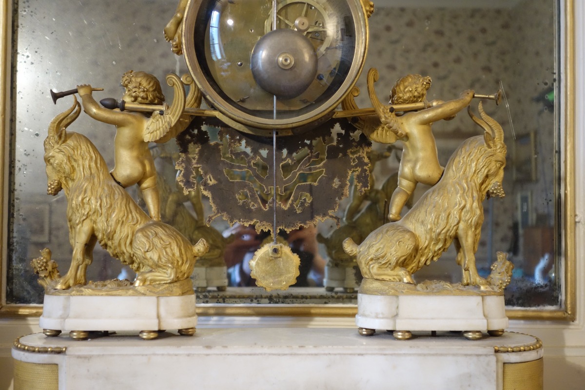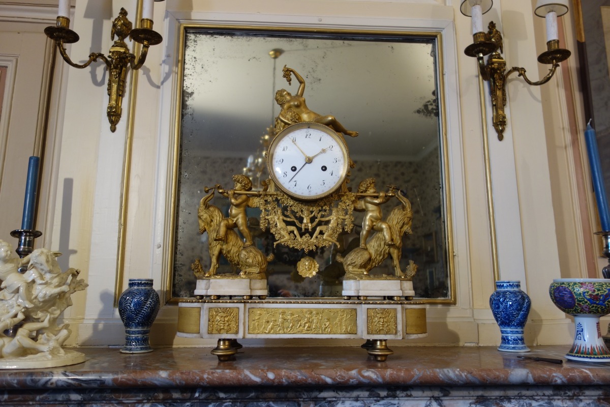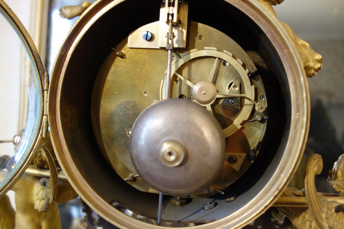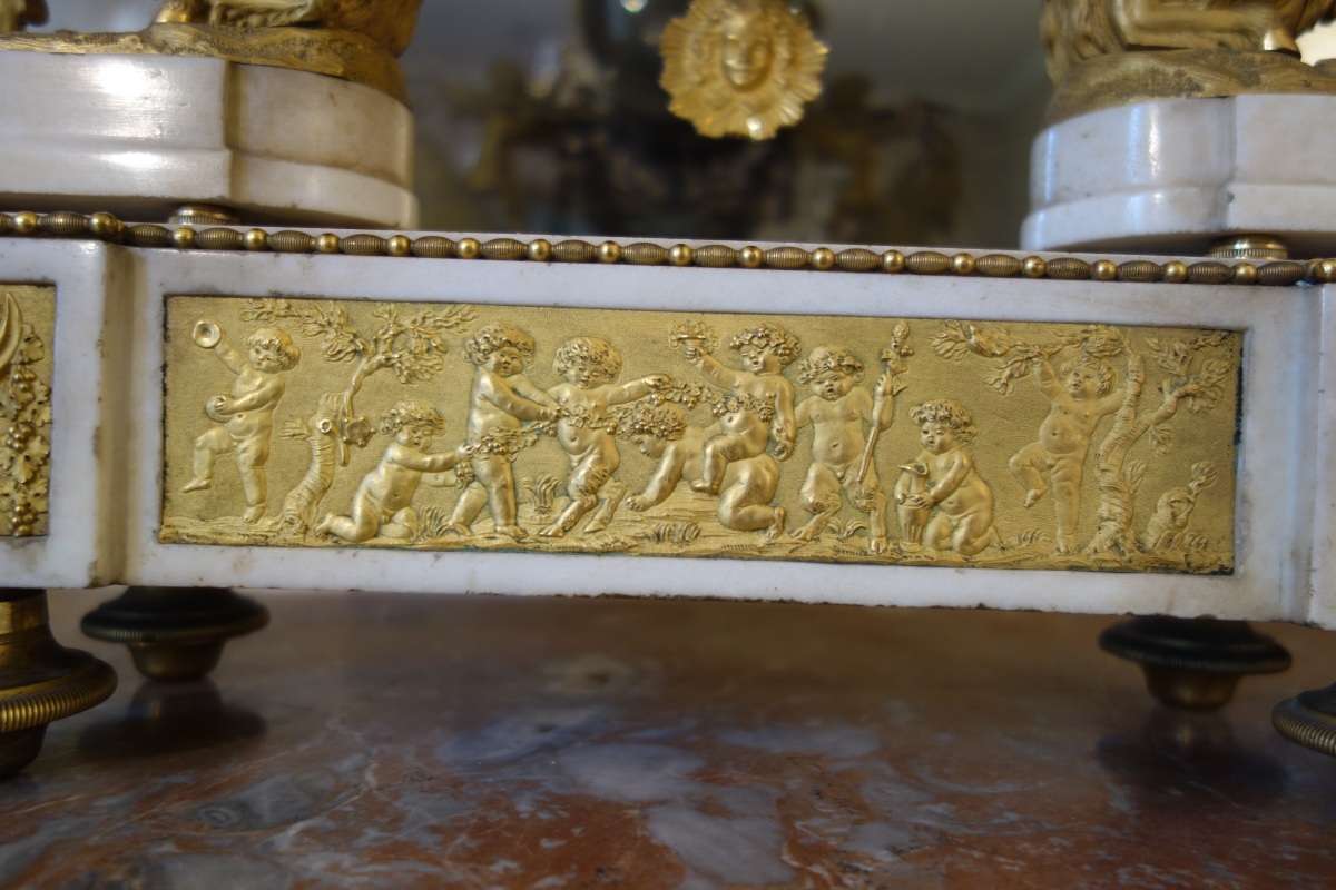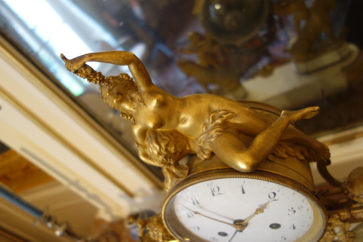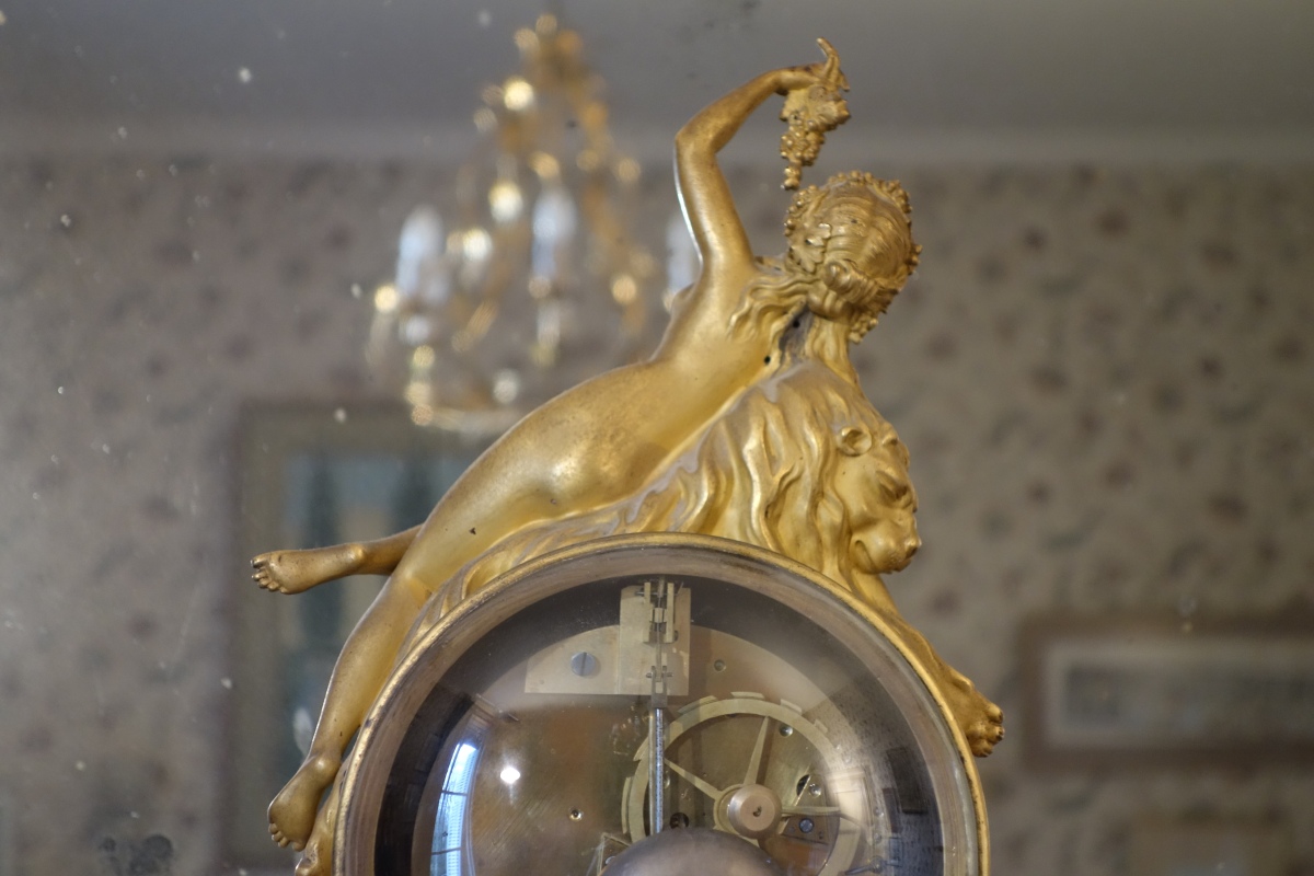PENDULE À LA BACHANTE en bronze doré sur un socle de marbre blanc à ressauts. Une bacchante allongée sur le cadran et adossée à une peau de lion tient dans sa main gauche une grappe de raisins. Le cadran circulaire est émaillé en noir, rouge et bleu avec les heures et les mois en chiffres arabes. Les gradués pour les minutes. Il est porté par deux angelots montés sur des boucs et sonnant dans une trompette. Le balancier à tête de soleil rayonnant. Une guirlande de pampres sert de balançoire à deux bacchantes et à un putti. Le socle de marbre est orné d'un bas-relief figurant des putti bachiques et des têtes de faunes. Il repose sur quatre pieds toupie. Le mécanisme est protégé par un écran de verre bombé. Suspension à plaque. Fines aiguilles dorées pour les heures et les minutes et métallique pour les secondes