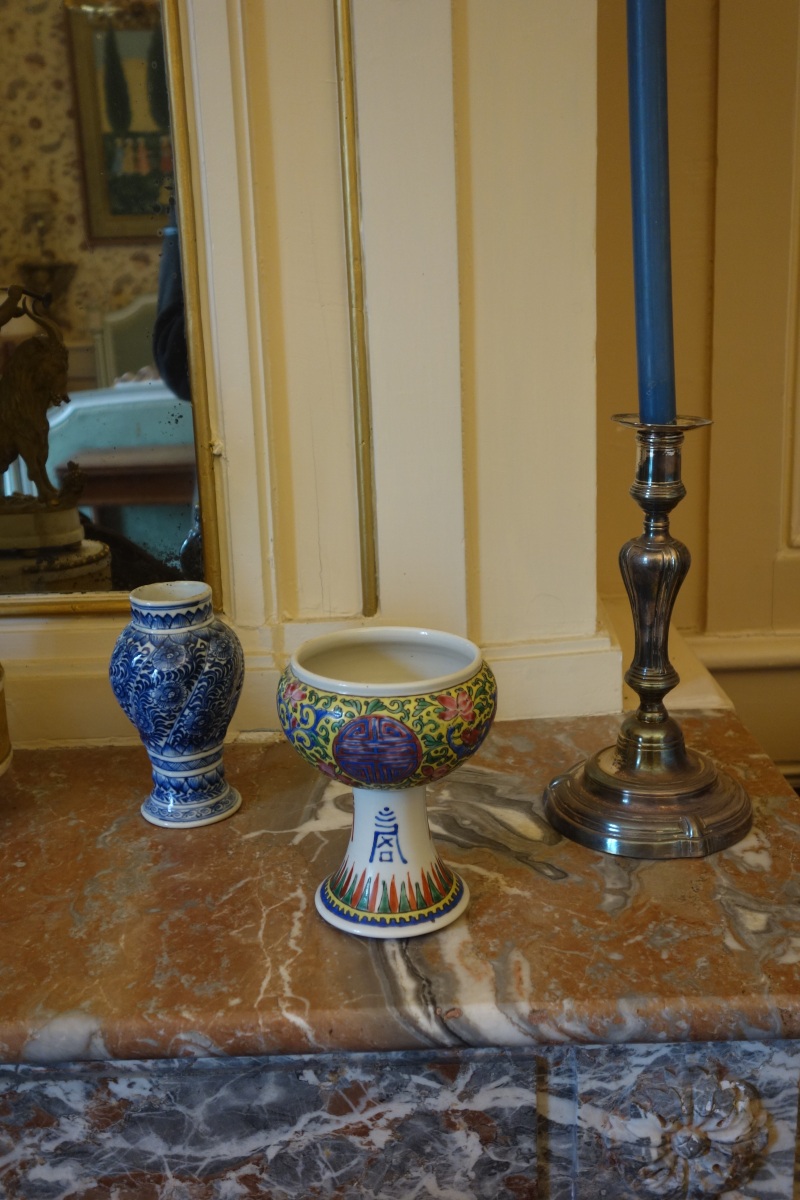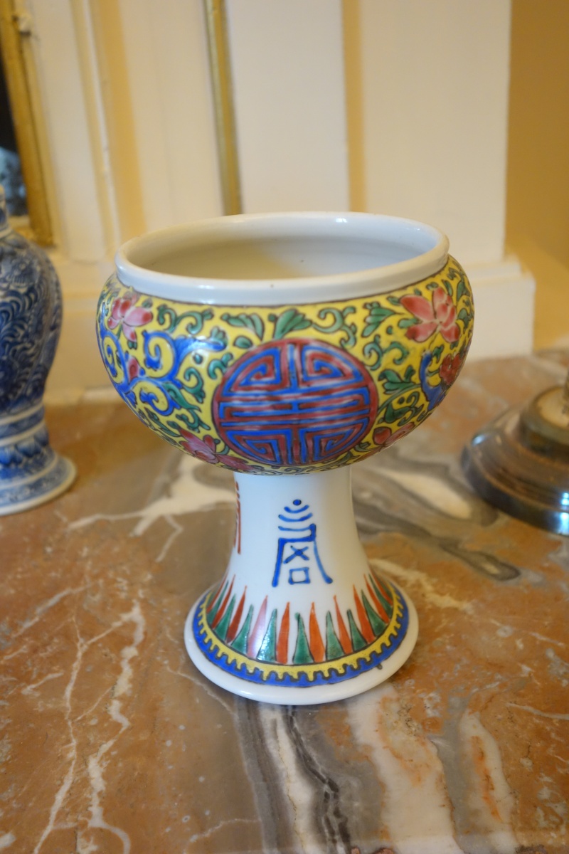CHINE. COUPE sur piédouche en porcelaine à fond jaune à décor de dragon bleu, fleurs roses et feuillages. Pied orné de calligraphie chinoise et frise colorée sur fond blanc. Haut. 15,5 cm.