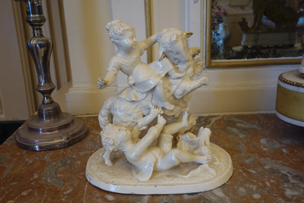 - Enfants jouant avec un mouton. FAÏENCE émaillée blanche (accidents).
