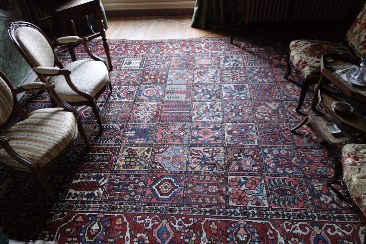 - TAPIS D'ORIENT en laine à fond rouge à décor de damiers accueillant des motifs géométriques. Env. 350 x 350 cm.