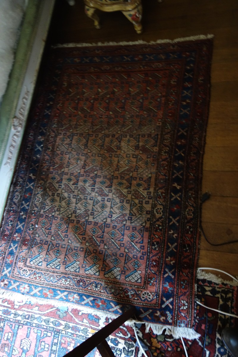 - TAPIS D'ORIENT en laine à fond rouge à décor de motifs géométriques. Bordure bleu encadrée par deux contre-bordures rouges. Env. 200 x 100 cm.