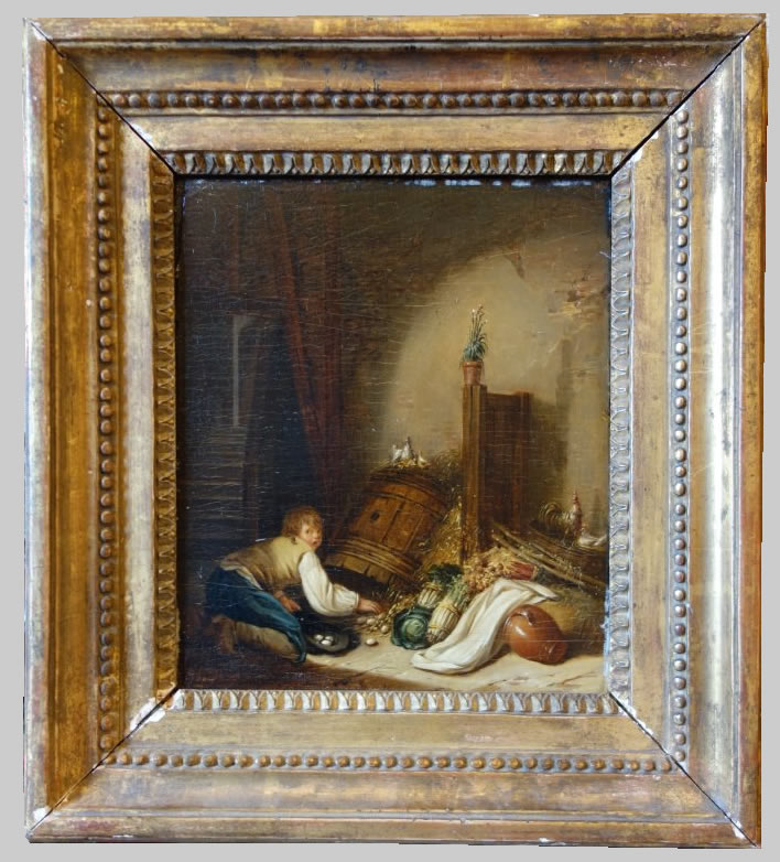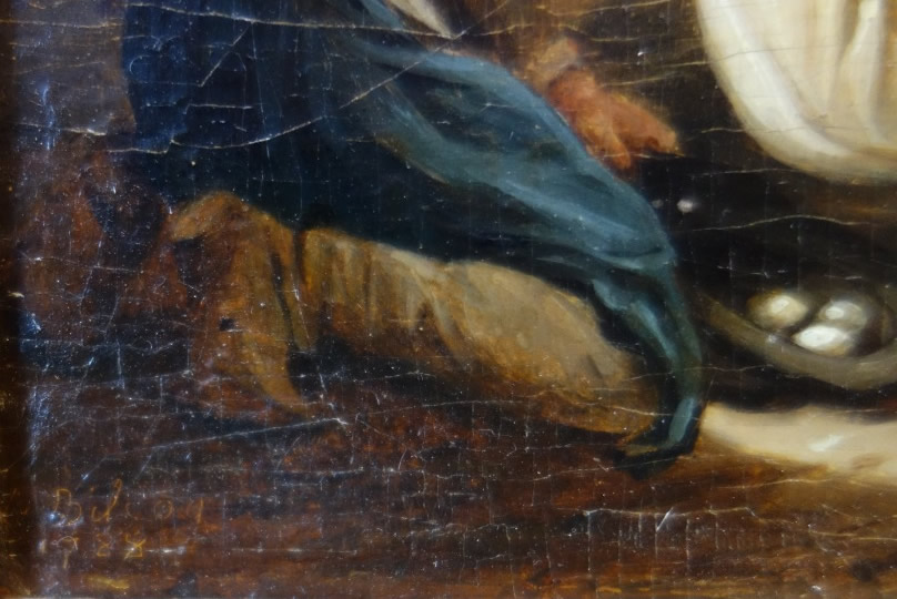 Huile sur panneau parqueté, signée en bas à gauche.