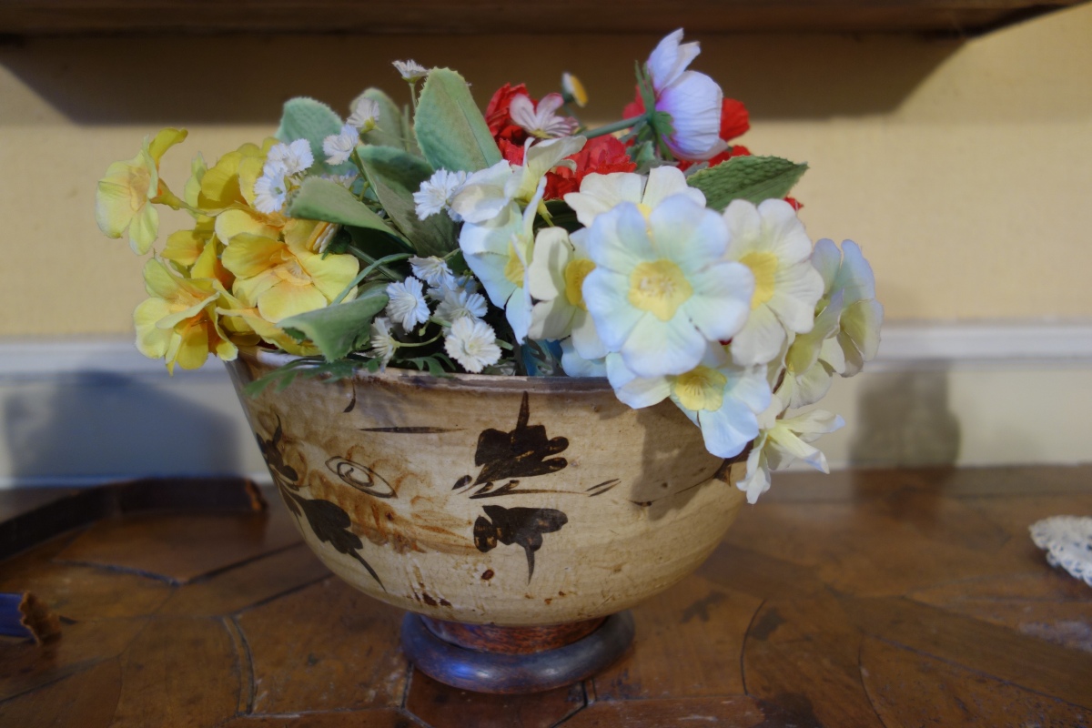 - BOMBONNIÈRE en porcelaine à décor de fleurs mauves sur fond vert.