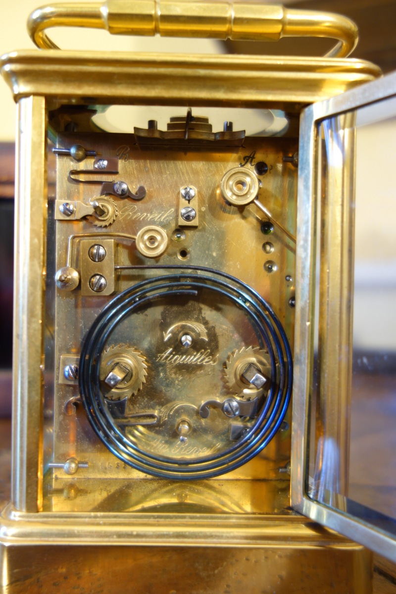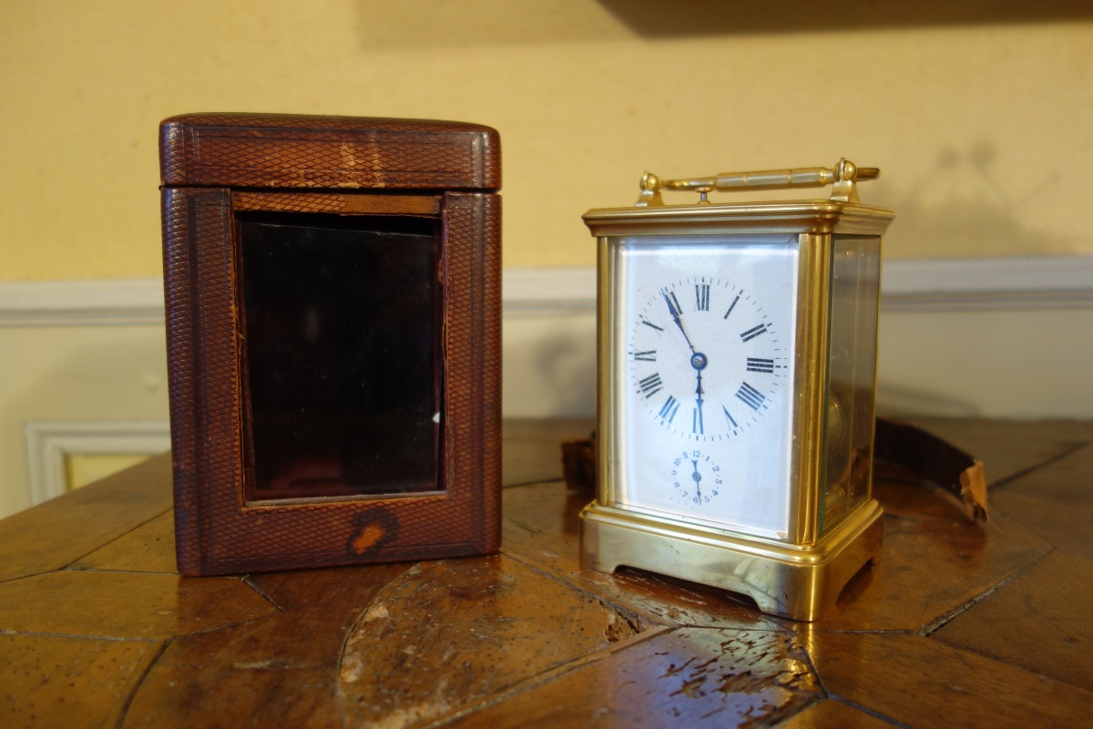 - PENDULE RÉVEIL DE VOYAGE à cage de glace dans son écrin en cuir.