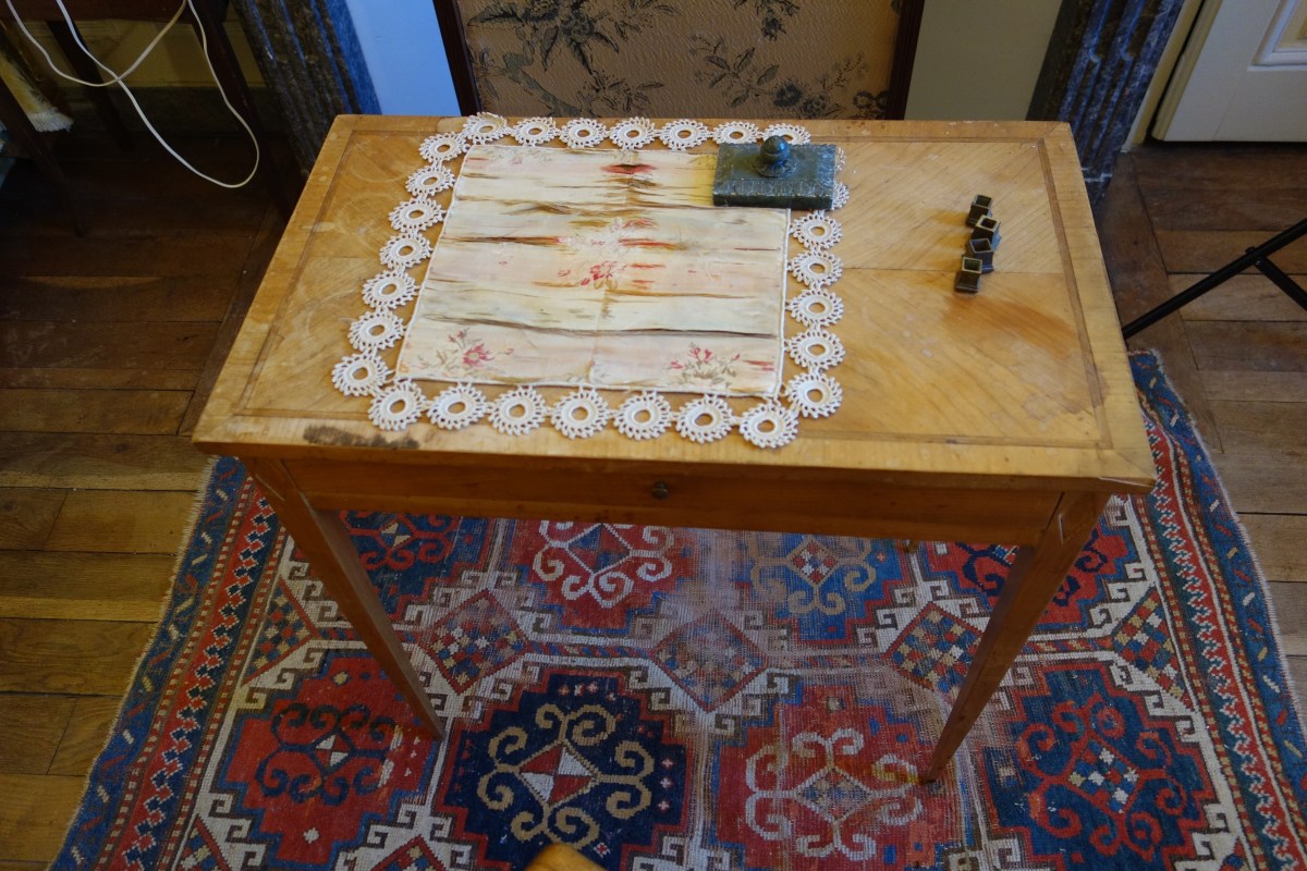 - Petite TABLE à ÉCRIRE en bois de placage. Plateau à frisage en fougère. Tiroir en ceinture. Pieds droits à section carrée ornés de sabots de bronze. XIXe. (usures au plateau)