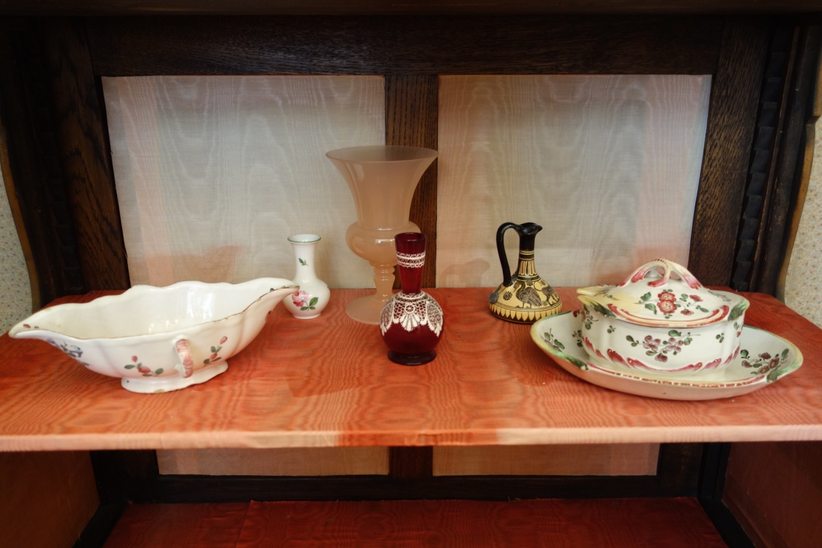 - SAUCIÈRE en faïence à décor de roses dans le goût de lEst. Long. 23 cm.