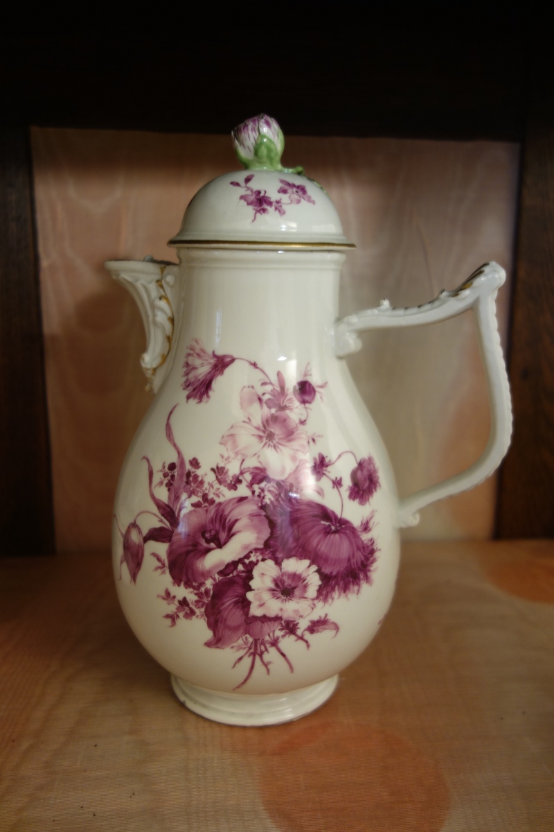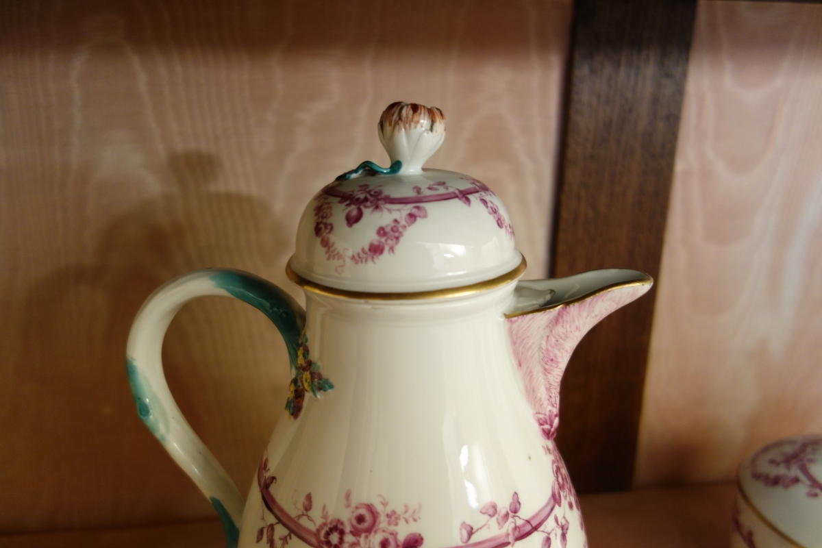 - PARTIE DE SERVICE À THÉ à décor de fleurs en camaïeu rose soutenu, dite pourpre de Cassius - comprenant deux VERSEUSES (Haut. 24 cm), deux TASSES et leurs SOUS-TASSE (Haut. 4,5 cm) et un SUCRIER COUVERT (Haut. 10 cm).