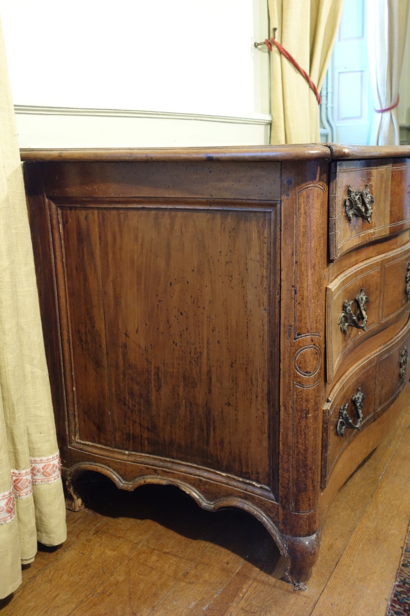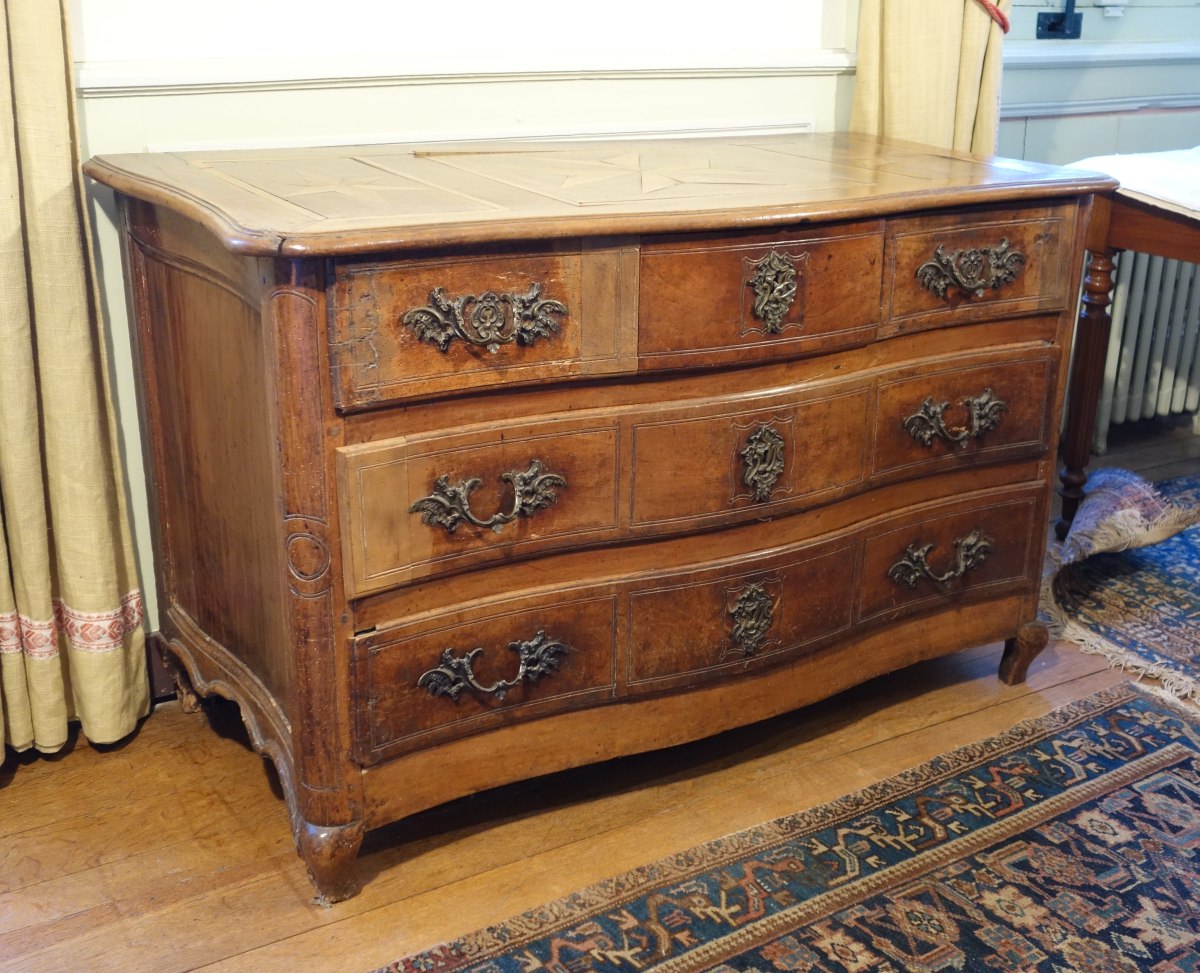 COMMODE à façade arbalète en bois naturel ouvrant par cinq tiroirs sur trois rangs. Le plateau marqueté de deux roses des vents entourant la croix de malte. Elle repose sur quatre petits pieds galbés.