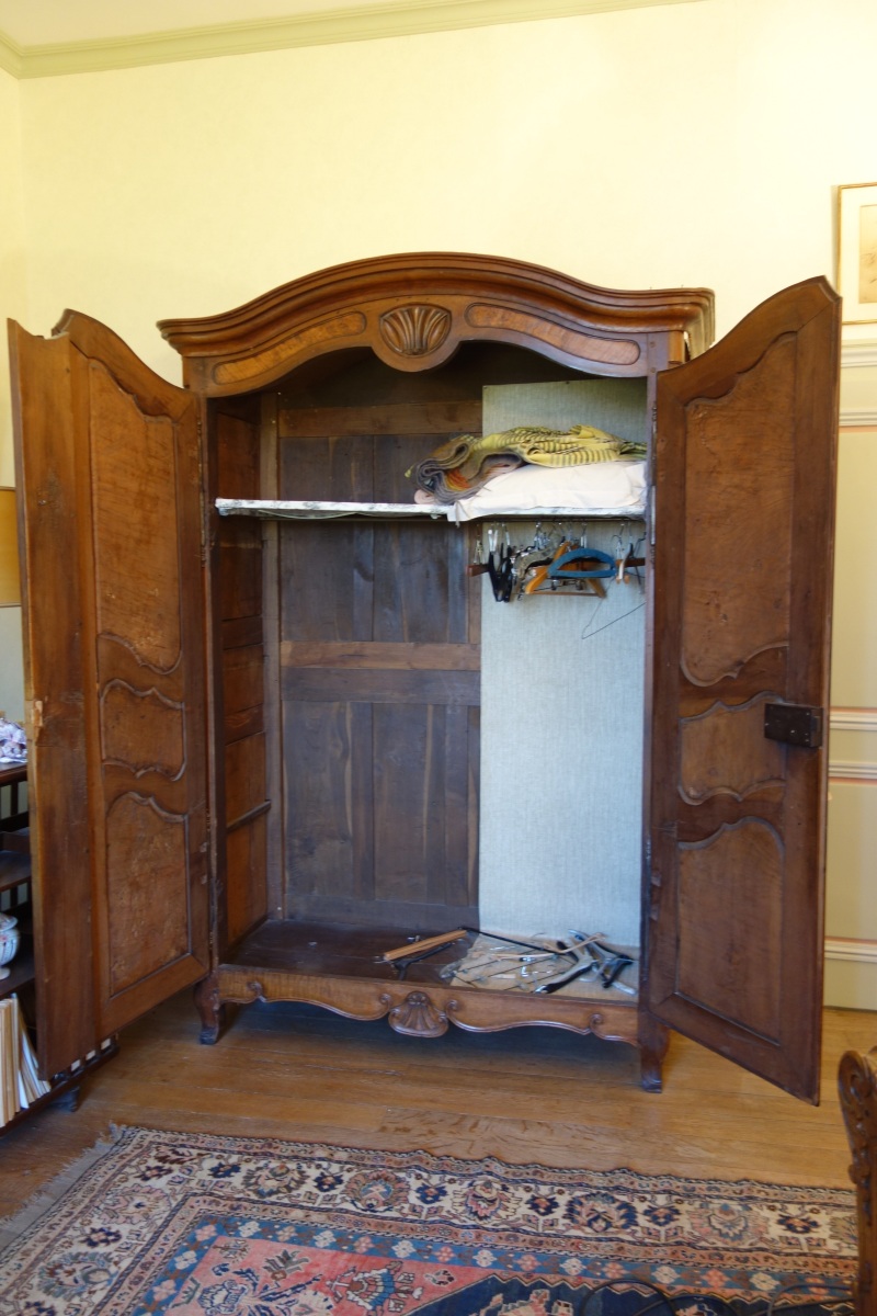 - Belle ARMOIRE en noyer et loupe à chapeau de gendarme ornée de coquilles stylisées